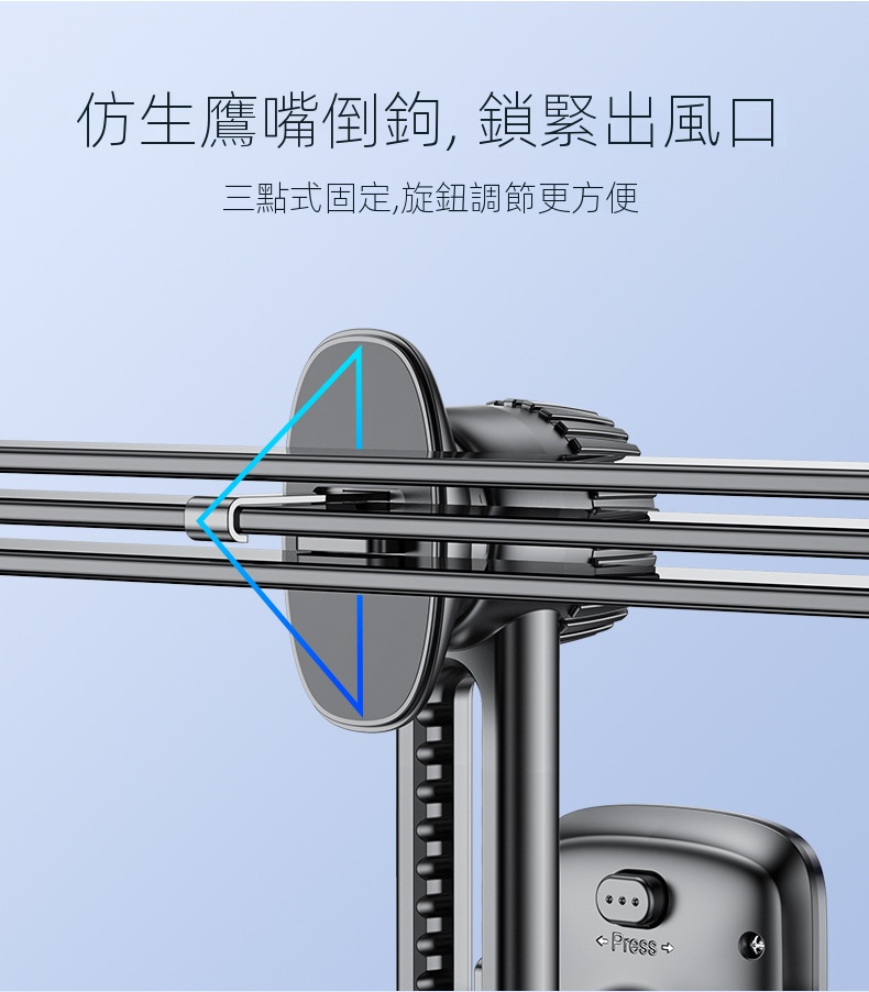 • 仿生鷹嘴倒鉤,鎖緊出風口,三點式固定,旋鈕調節更方便。