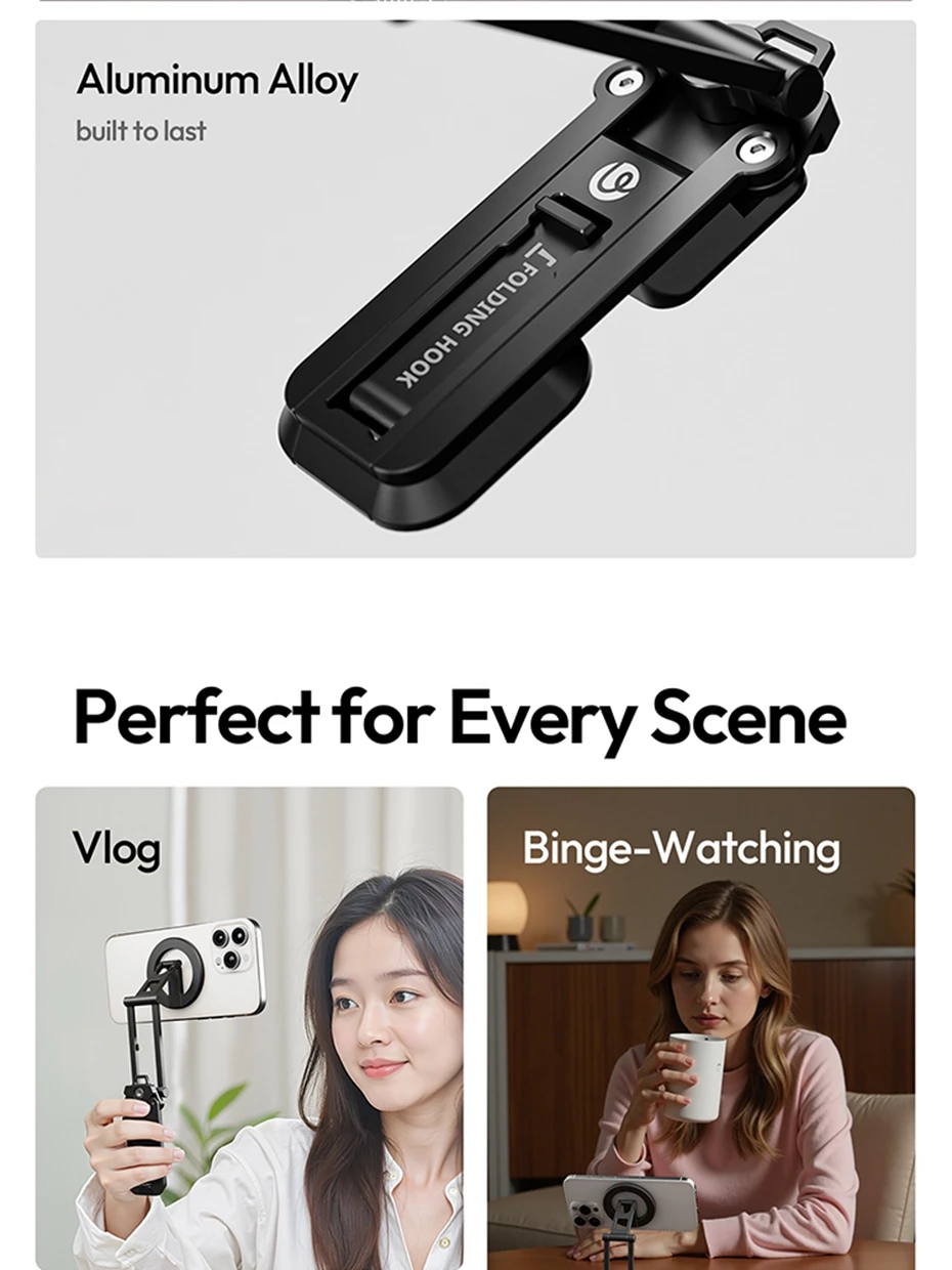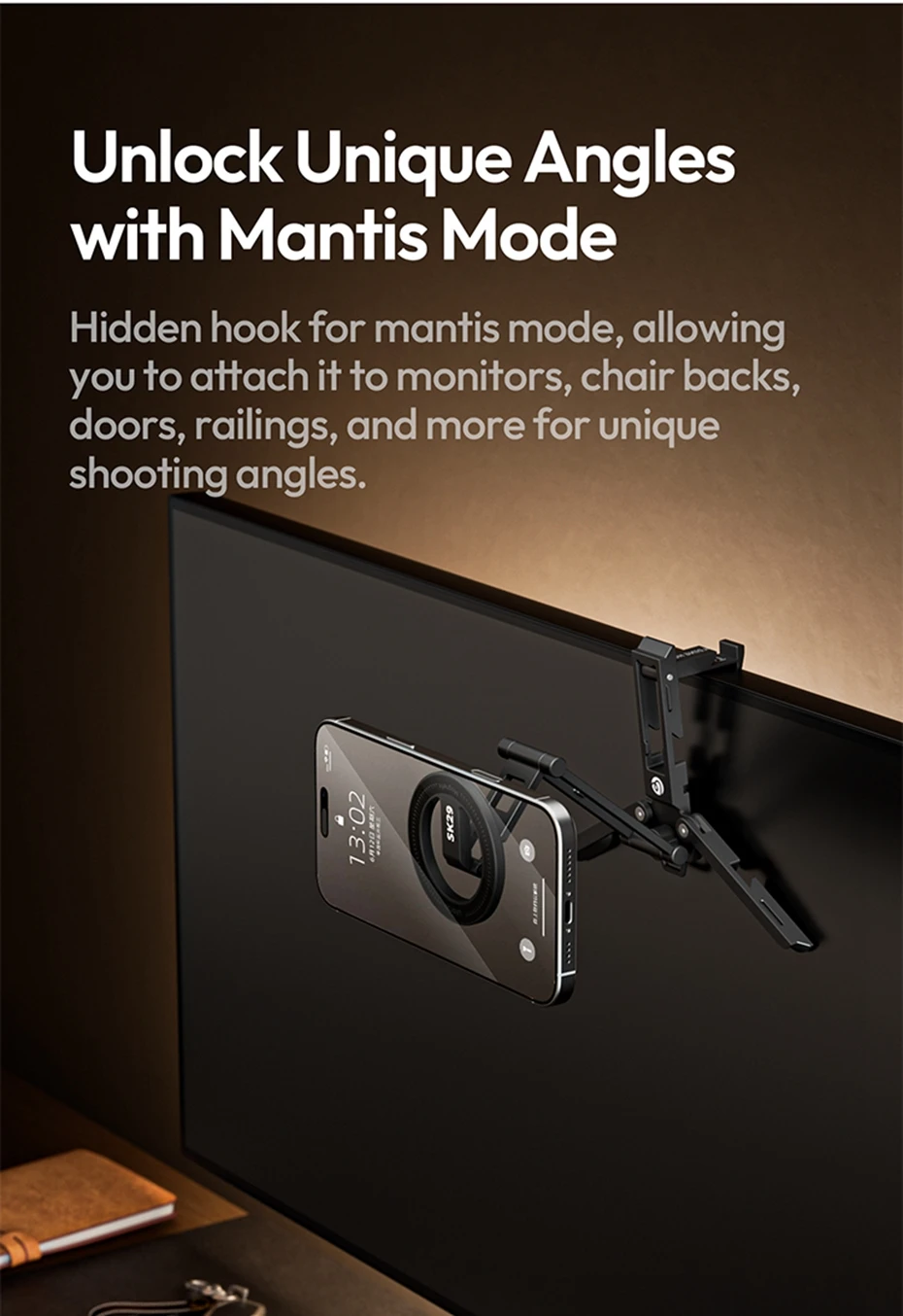 • 創新倒掛模式:底部隱藏式掛鉤設計,可快速轉換為倒掛模式,輕鬆實現俯瞰視角拍攝,為拍攝手帳、產品展示等提供新穎視角。