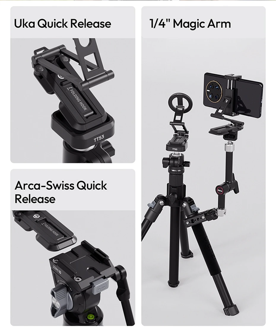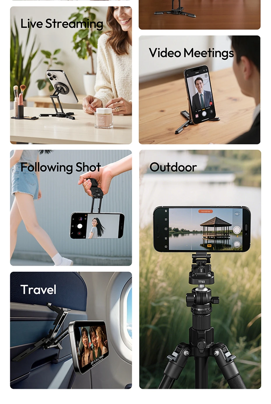 • 便利折疊設計:採用獨特的四段式折疊構造,關節伸展順滑,能自由調節高度與俯仰角度,快速適配不同場景需求,收納後體積小巧,方便攜帶。