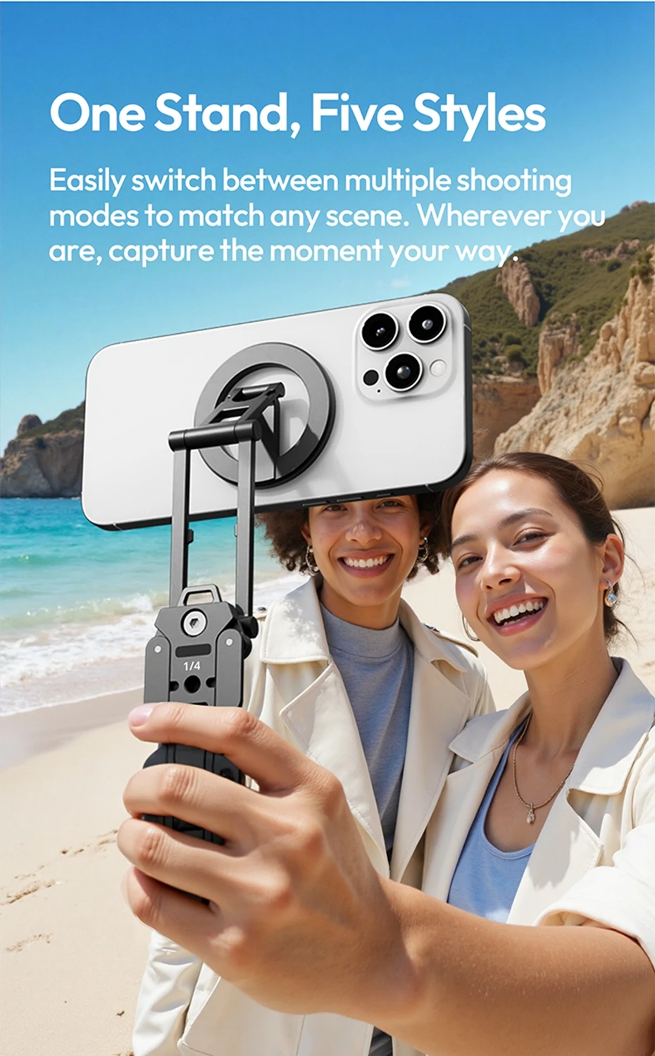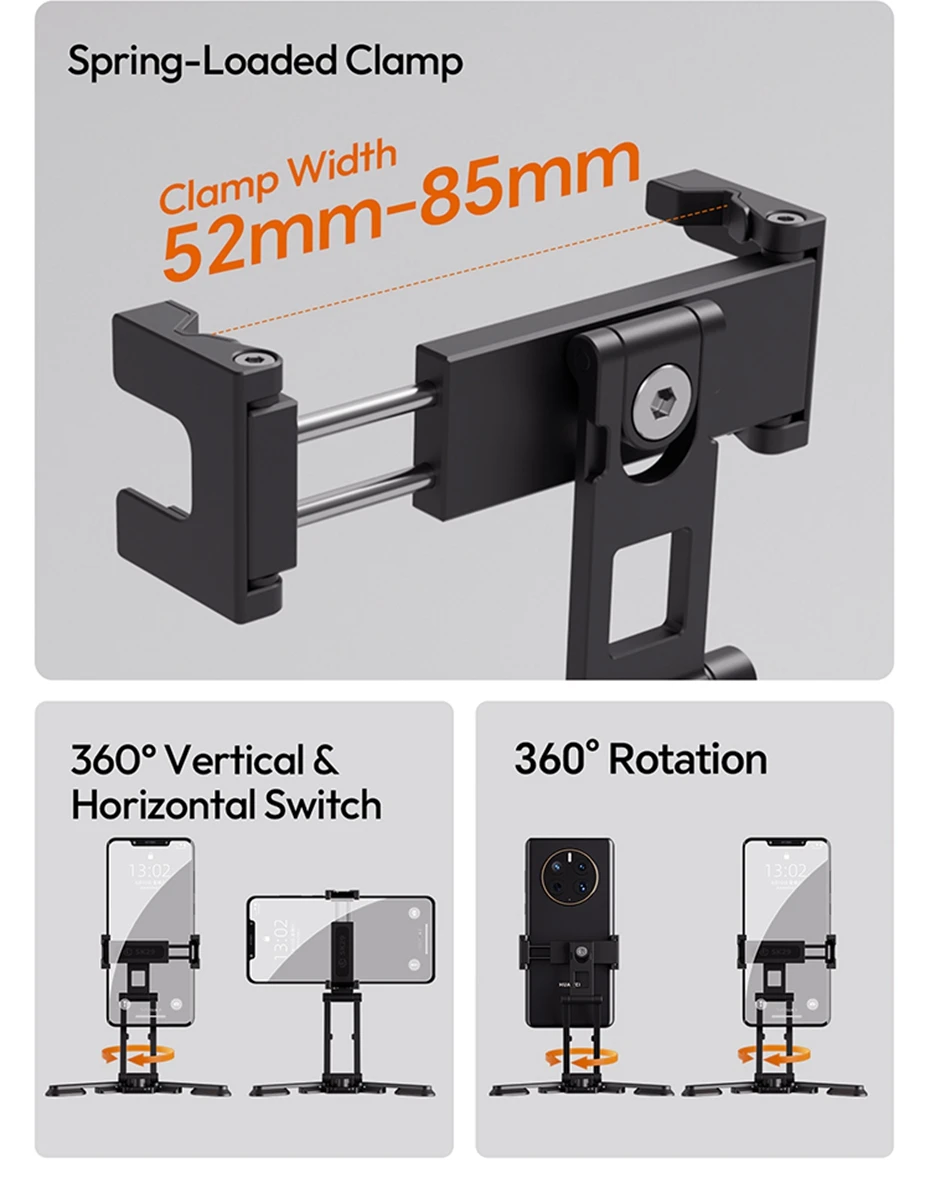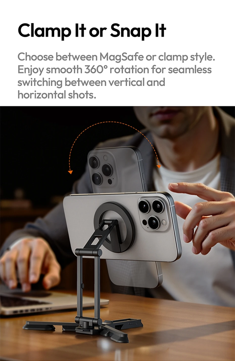 • 360° 靈活旋轉:支架支援全方位 360° 流暢旋轉,無論是豎屏記錄生活點滴、拍攝社交媒體素材,還是橫屏創作視頻,都能隨心切換,輕鬆捕捉理想角度。