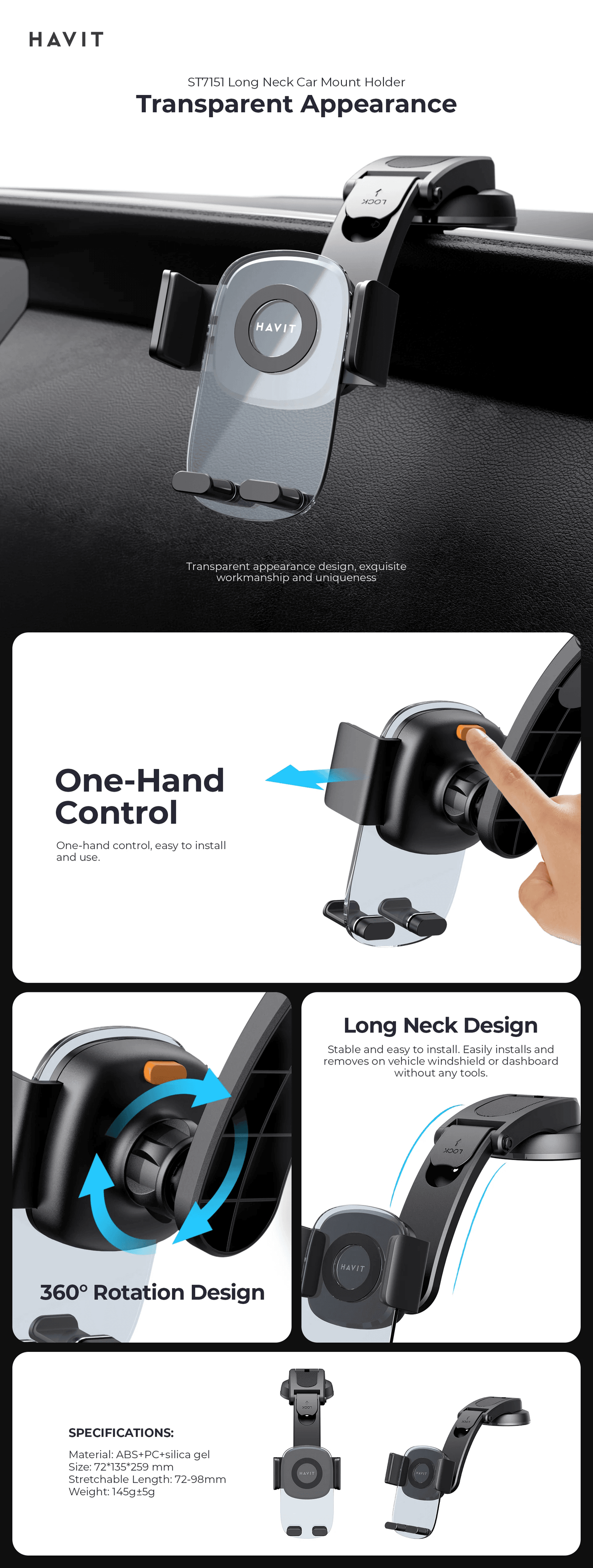 Buy HAVIT ST7151 錶台式車載手機支架 - 黑色 | 透明外觀 | 單手控制 | 長領設計 | 360°旋轉設計 | 香港行貨 price in outletexpress .com Hong Kong.In promotion and sale.