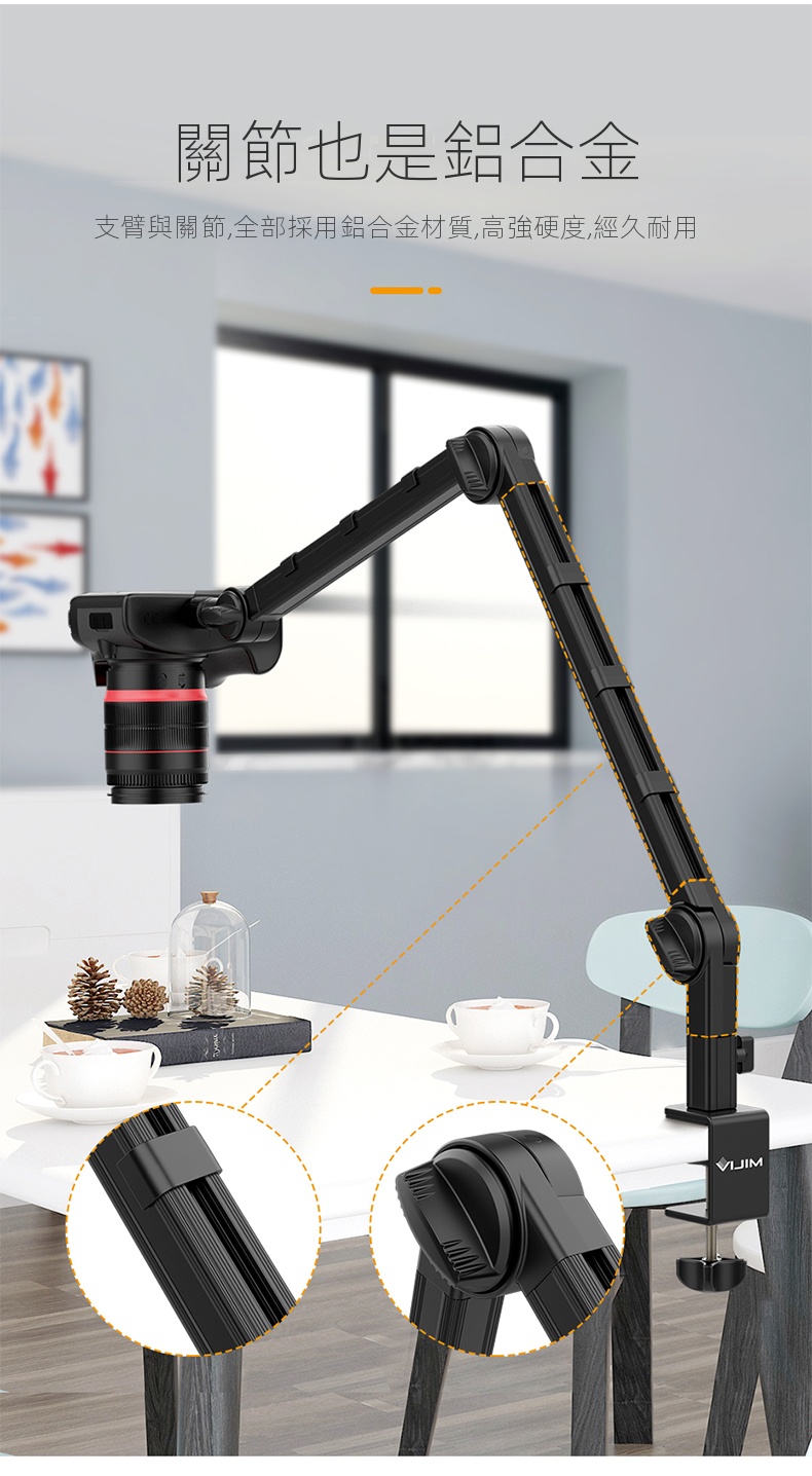 VIJIM LS25 桌面俯拍支架是一款多功能且靈活的桌面裝置,專為攝影愛好者和創作者設計。該支架採用鋁合金材質,具有高強度和耐用性,確保長期使用穩定可靠。其三段式懸臂設計可實現多角度調節,最大旋轉範圍達360°,滿足不同拍攝需求。 定向旋鈕設計讓麥克風能夠精準旋轉,確保拾音方向始終對準發聲處,提升錄音品質。LS25不僅適合專業攝影,也適用於日常直播、遠端會議等場景,是提高工作效率與創作體驗的理想選擇。
