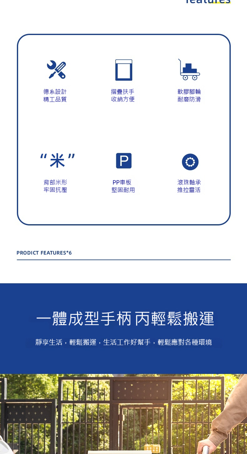 得力DL-6112平板搬運手推車,是家庭與辦公室搬運的實用之選。車板採用加厚PP材質,堅固耐用且有韌性,背部“米”字形加強筋設計,抗壓抗衝擊,可承重300KG ,輕鬆應對日常物品搬運。配備滾珠軸承輕音輪,軟膠材質耐磨防滑,推拉穩定且運作噪音小,室內使用不會幹擾。一體成型手柄,搬運更輕鬆。整體可折疊,節省存放空間,無論是搬運辦公用品、家居雜物,還是超市購物拉貨,都能高效完成,為您的生活和工作帶來便捷。