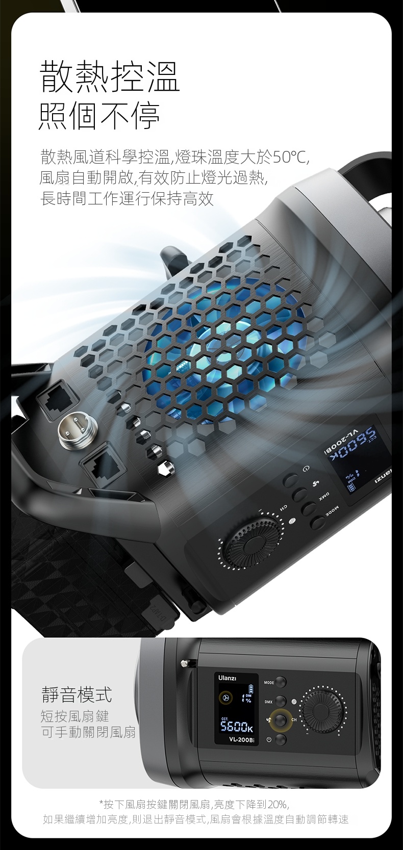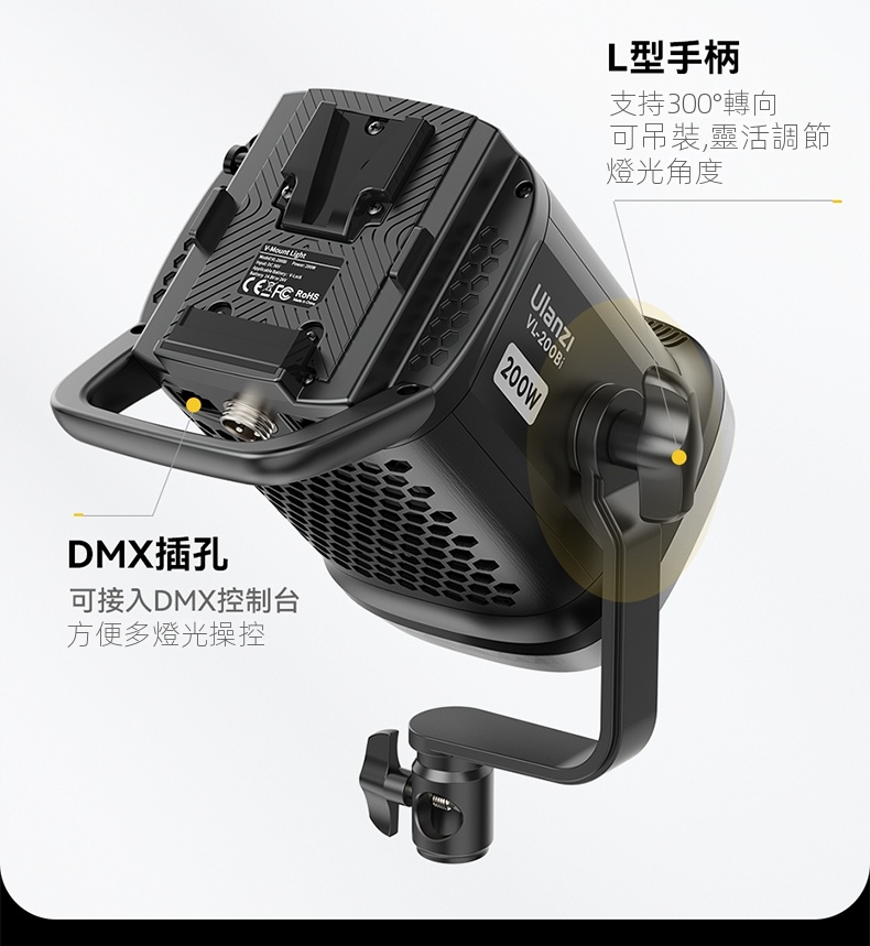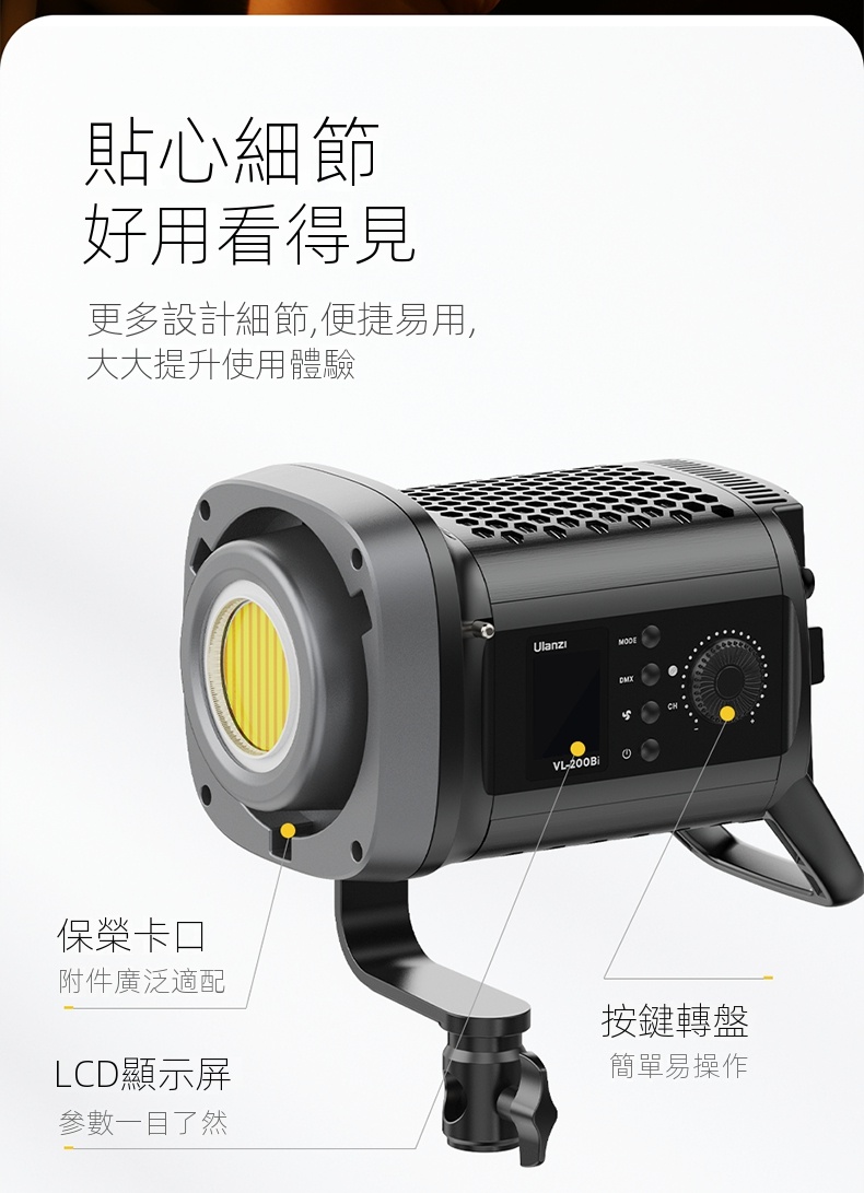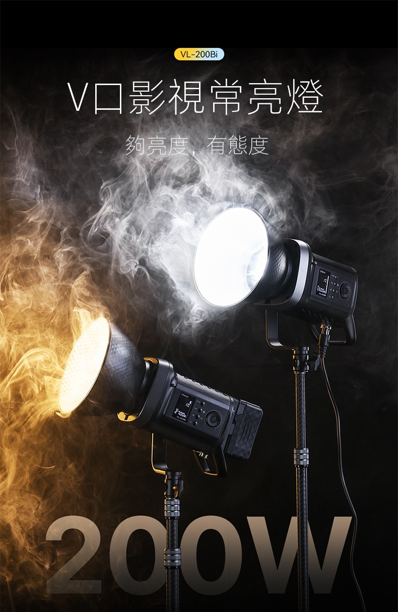 Ulanzi VL-200Bi 是一款高性能的V口補光燈,專為專業攝影和視頻製作設計。其200W強勁輸出提供高亮度和穩定的光源,適合各種拍攝場景。採用COB燈珠技術,確保光線均勻柔和,顯色指數CRI超過95,還原真實色彩,呈現自然飽和的效果。 該產品支援冷暖色溫無級調節(2700K-6500K),滿足不同環境需求,並內置六種燈光特效,可輕鬆模擬多種場景,提升創作靈感。配備手機APP遙控功能,可在30米範圍內實現遠程控制,方便調整色溫、亮度及光效等參數。 VL-200Bi 提供兩種供電方式:V口電池和DC航空插頭,適用於室內與戶外拍攝,靈活轉場。散熱系統科學設計,有效防止過熱,保證長時間高效運行。此外,保榮卡口設計兼容多種附件,擴展應用範圍。整體設計簡潔實用,操作便捷,是專業攝影師和視頻創作者的理想選擇。