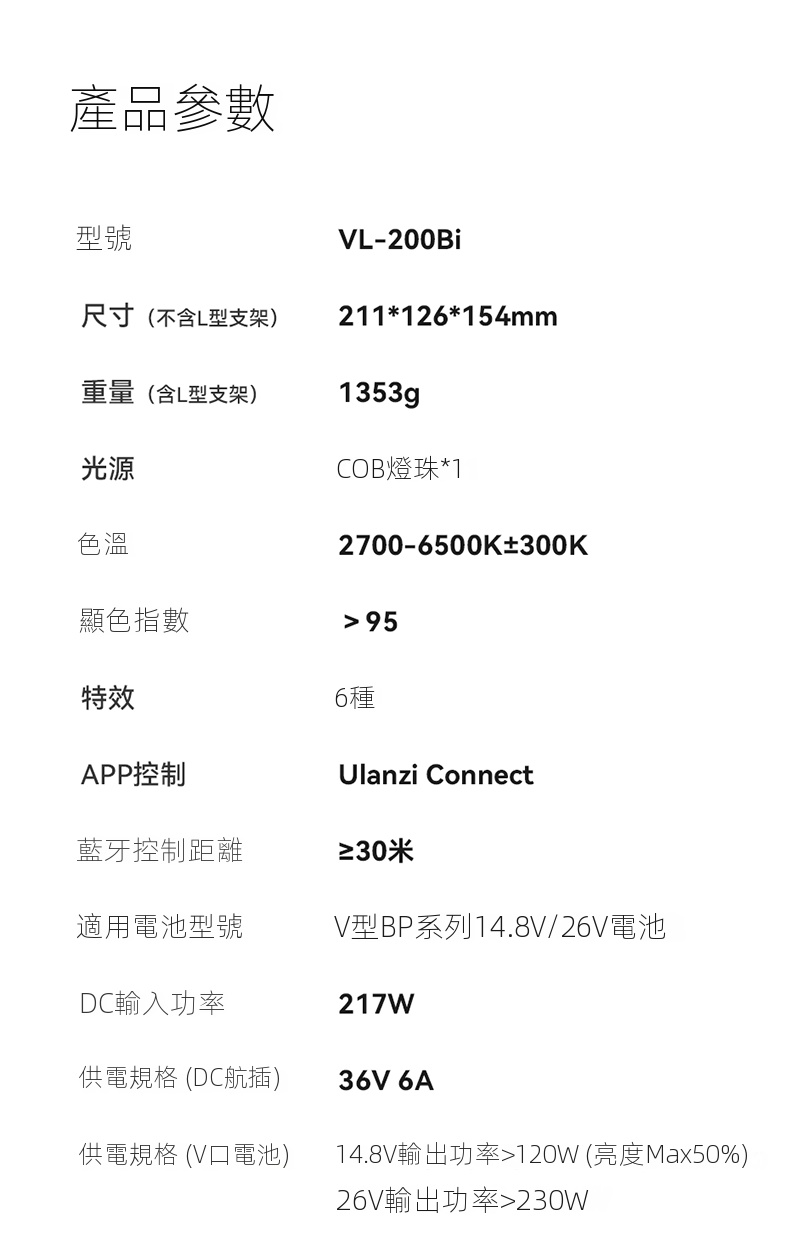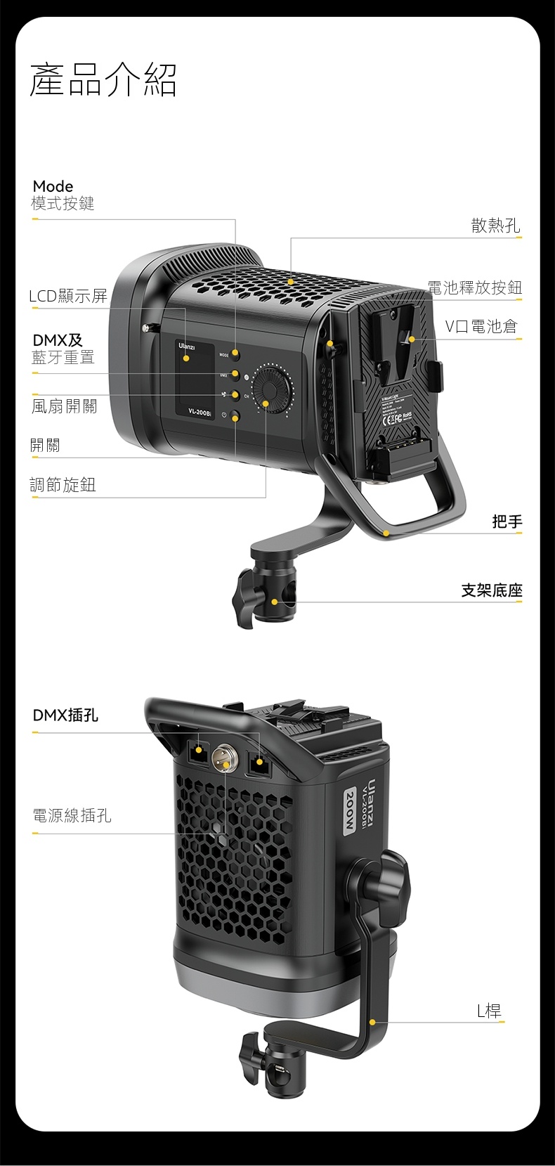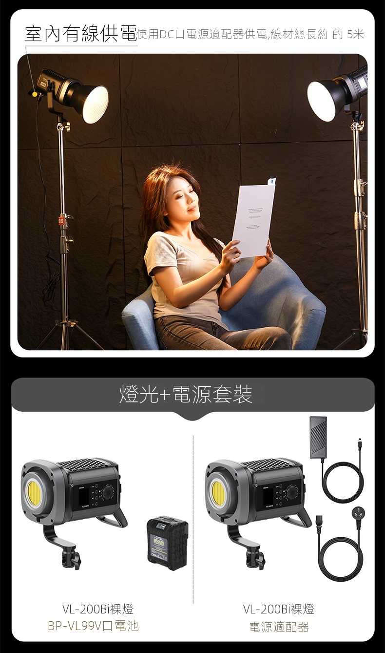 Ulanzi VL-200Bi 是一款高性能的V口補光燈,專為專業攝影和視頻製作設計。其200W強勁輸出提供高亮度和穩定的光源,適合各種拍攝場景。採用COB燈珠技術,確保光線均勻柔和,顯色指數CRI超過95,還原真實色彩,呈現自然飽和的效果。 該產品支援冷暖色溫無級調節(2700K-6500K),滿足不同環境需求,並內置六種燈光特效,可輕鬆模擬多種場景,提升創作靈感。配備手機APP遙控功能,可在30米範圍內實現遠程控制,方便調整色溫、亮度及光效等參數。 VL-200Bi 提供兩種供電方式:V口電池和DC航空插頭,適用於室內與戶外拍攝,靈活轉場。散熱系統科學設計,有效防止過熱,保證長時間高效運行。此外,保榮卡口設計兼容多種附件,擴展應用範圍。整體設計簡潔實用,操作便捷,是專業攝影師和視頻創作者的理想選擇。