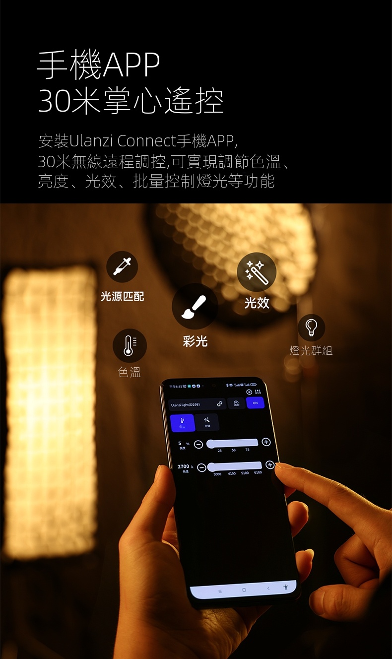 • 手機APP遙控功能,可遠程調整色溫、亮度及光效等參數