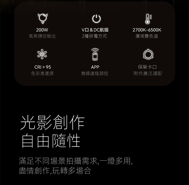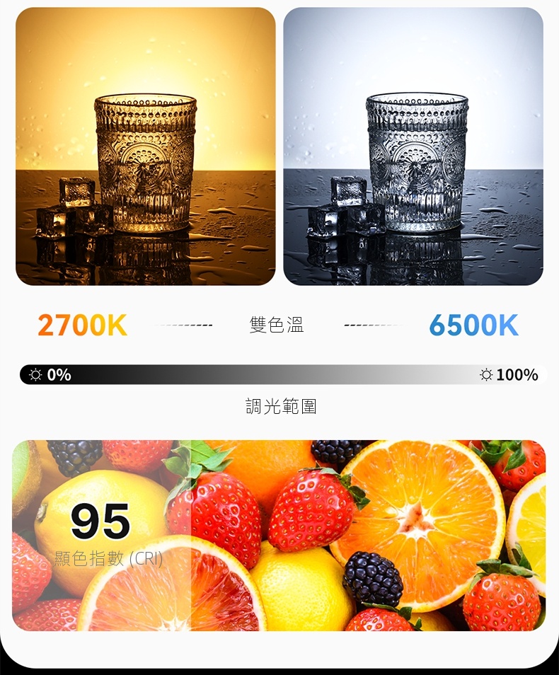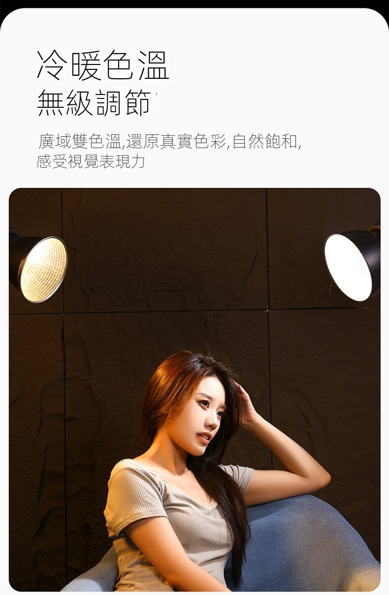 • 冷暖色溫無級調節(2700K-6500K),滿足多種拍攝需求