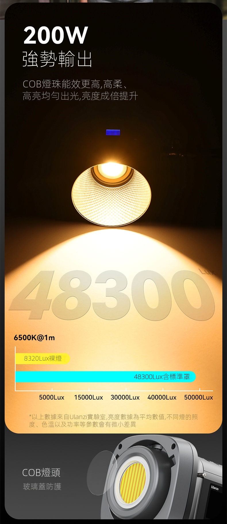 • 照度(含標準罩):48300 Lux,6500K@1m