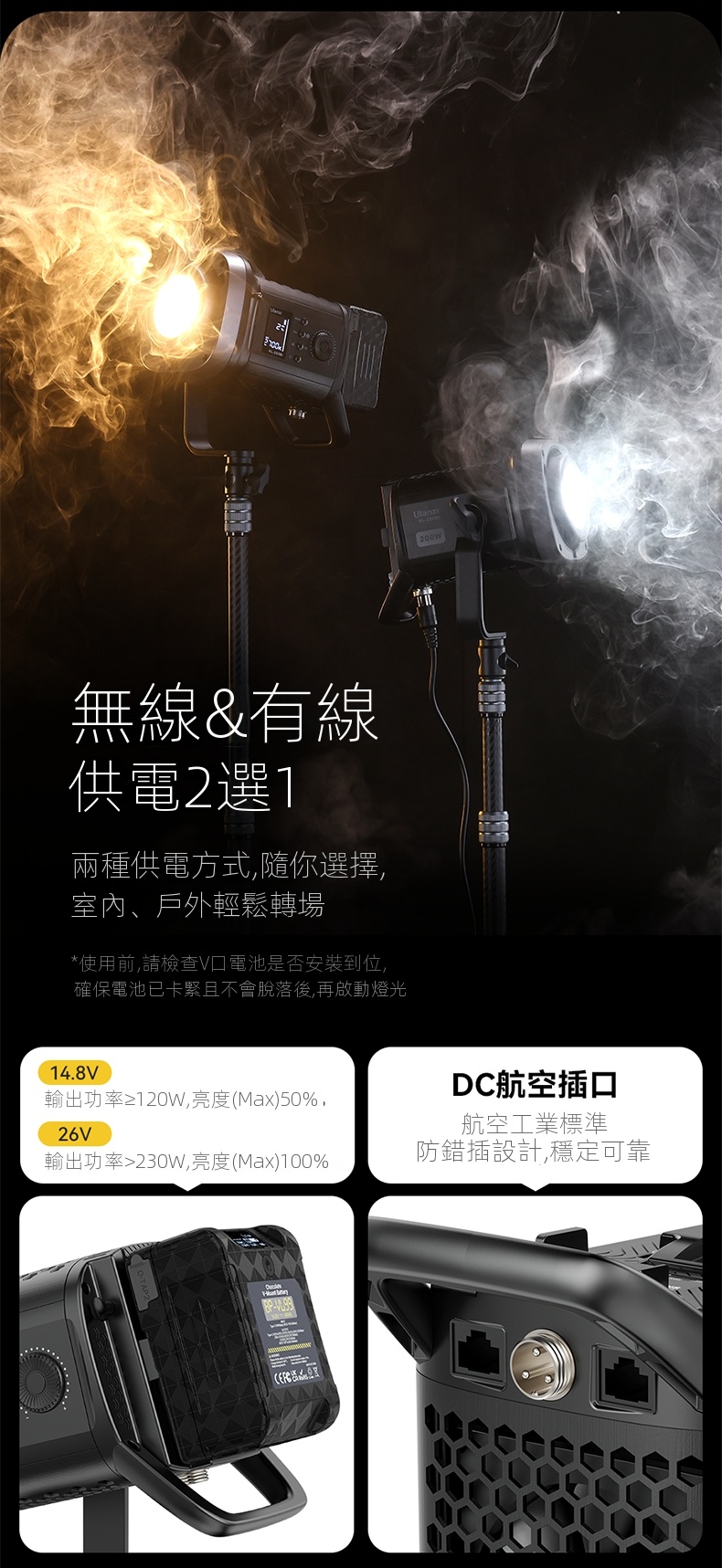 • 供電規格(V口電池):14.8V 輸出功率>120W(亮度Max 50%),26V 輸出功率>230W