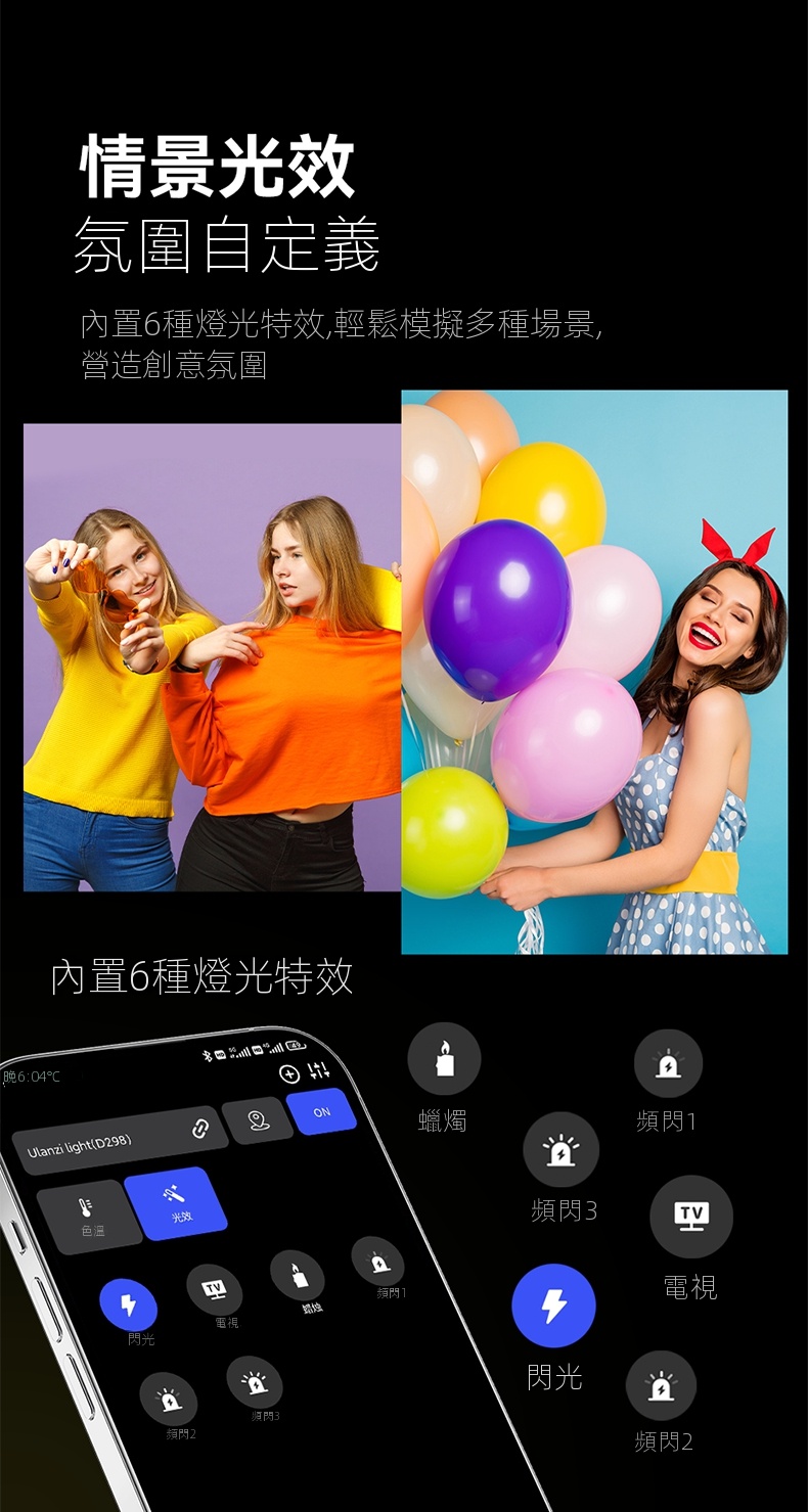 • 內置六種燈光特效,輕鬆模擬多種場景