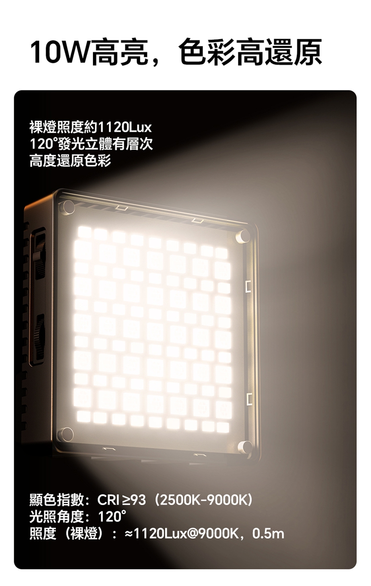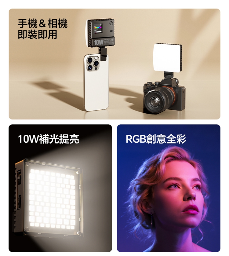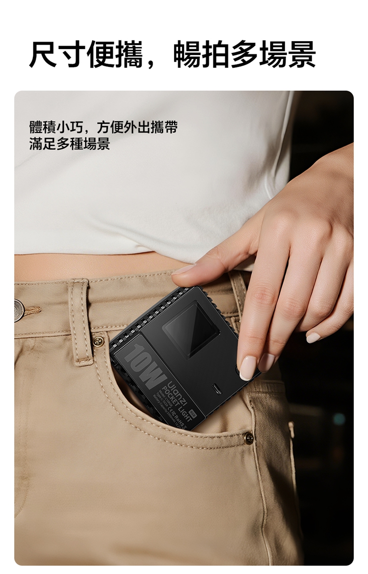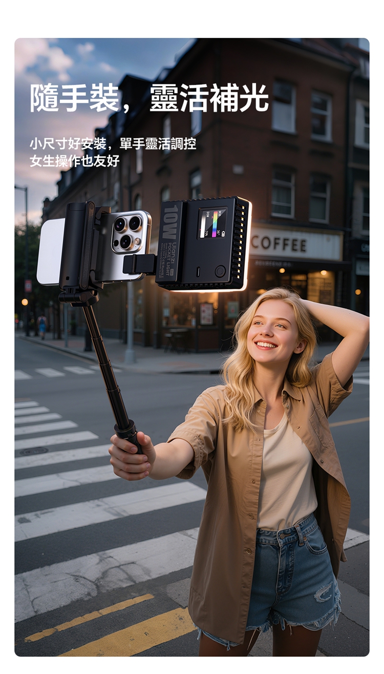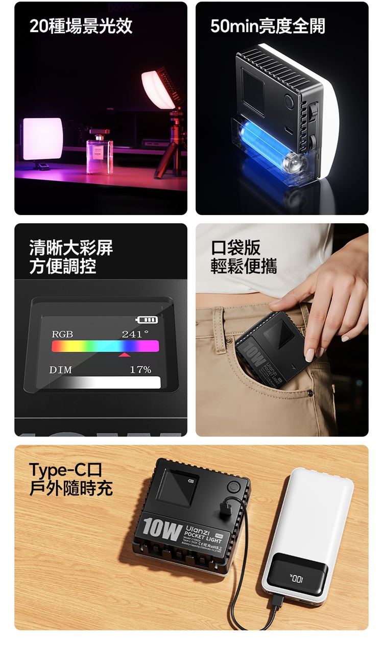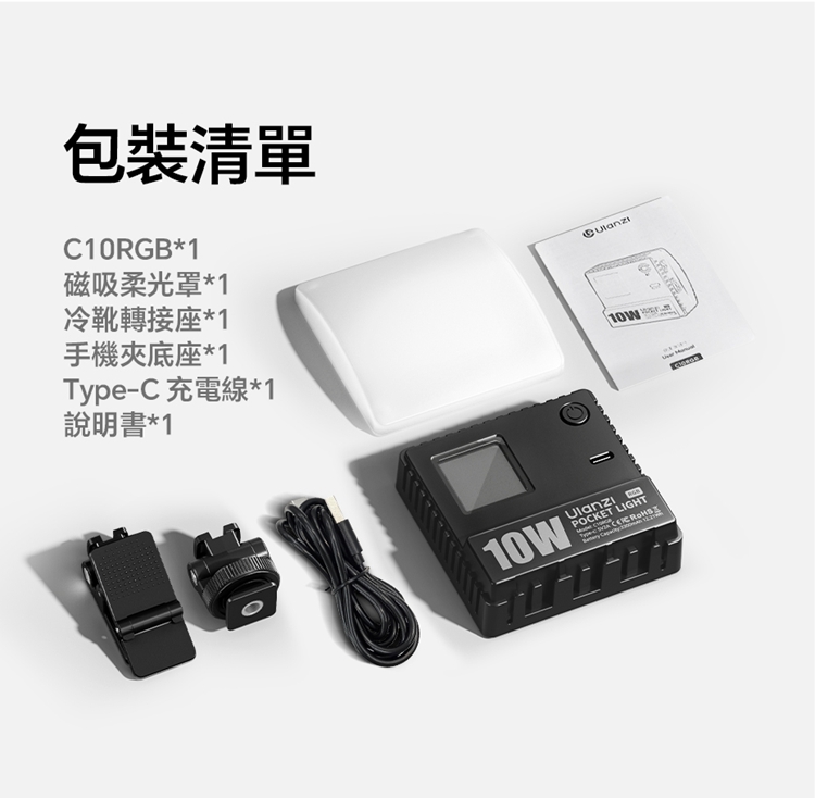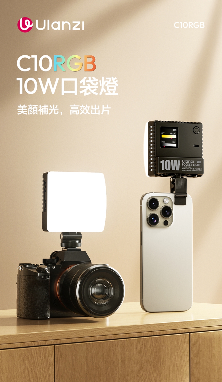 ULANZI C10RGB 是一款集高亮度與豐富色彩於一身的10W口袋型RGB補光燈。其核心亮點在於內建了多種專業光效模式,包括閃電、電視、警車等動態效果,並支援自訂RGB全彩色彩調整(360°色相及0-100%飽和度),能輕鬆營造各種創意氛圍。產品採用高顯色性LED,CRI≥95,TLCI≥96,確保色彩還原真實。燈具雖小巧便攜,但亮度出色,最高達1000流明,並提供1%-100%無級調光。它擁有直觀的OLED顯示螢幕,操作一目了然。內建2600mAh大容量電池,支援Type-C快充,並能作為行動電源為手機等設備充電。隨附的柔光罩可讓光線更柔和,加上磁吸設計、1/4英寸螺孔和多種配件,使其成為行動拍攝、直播、影片創作的強力隨身工具。