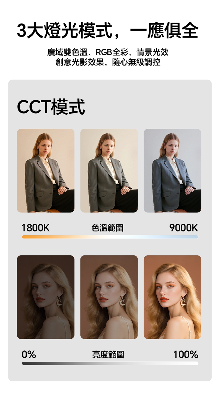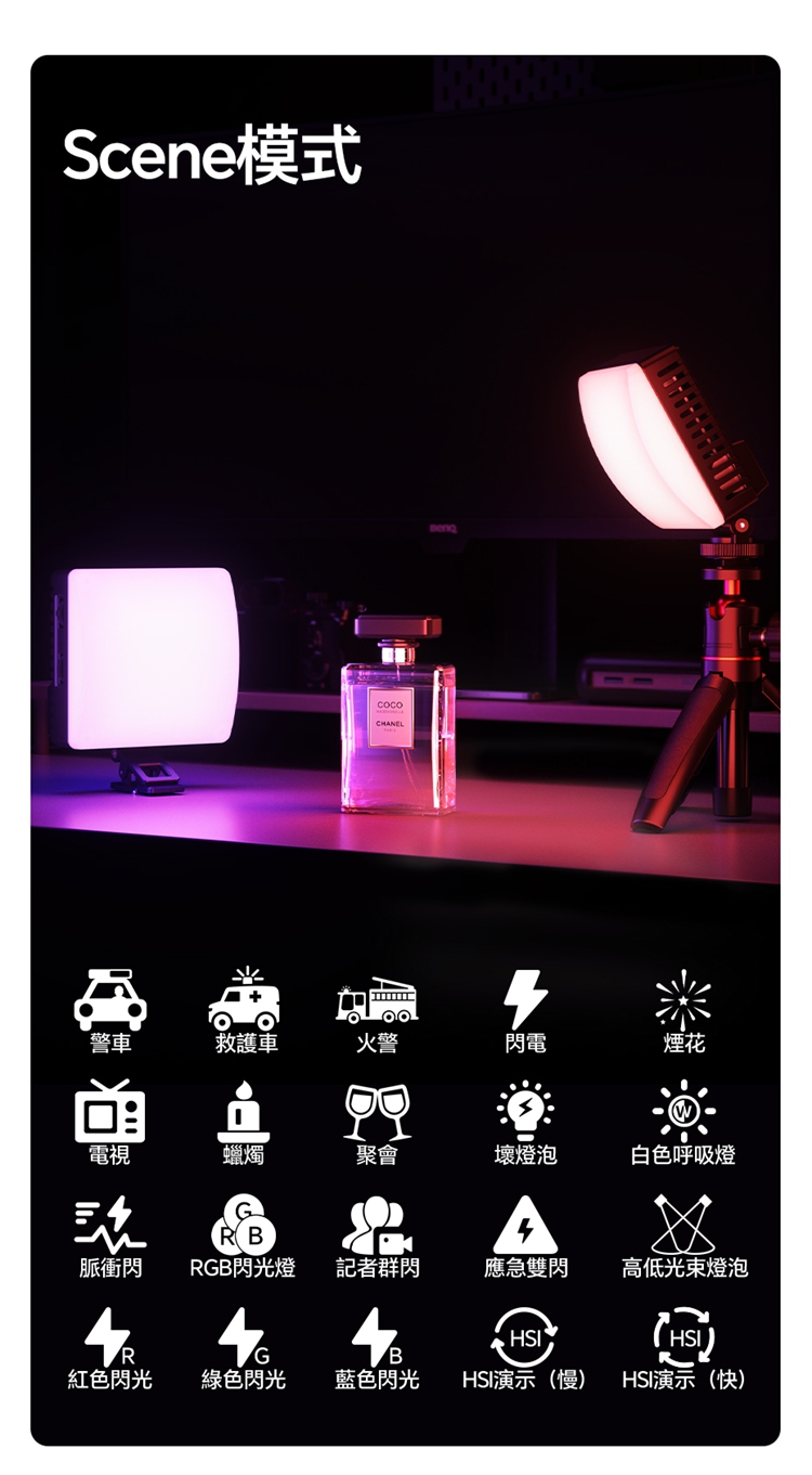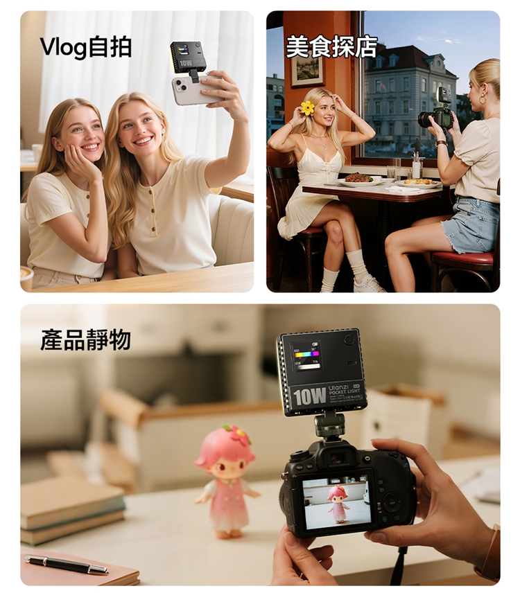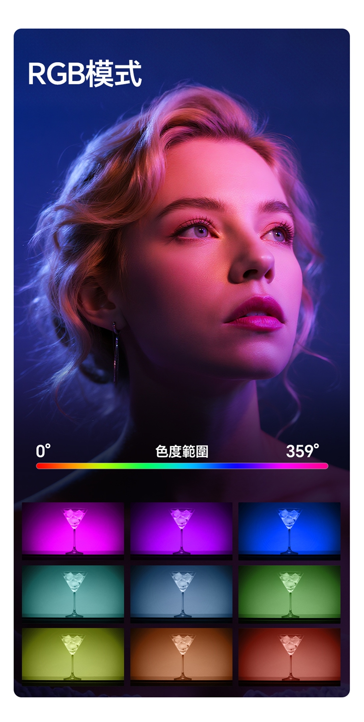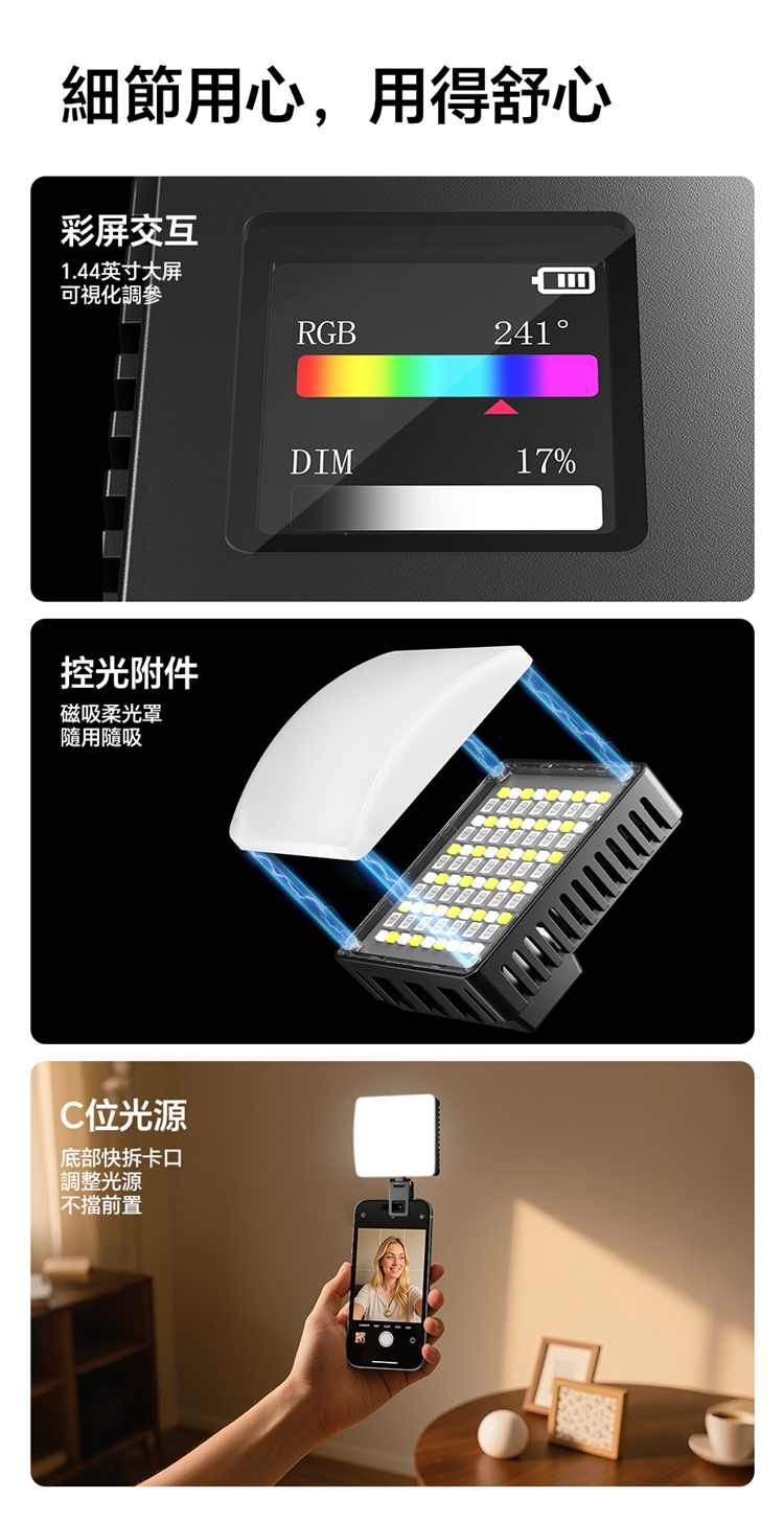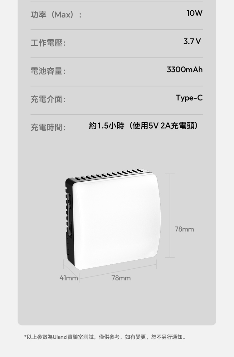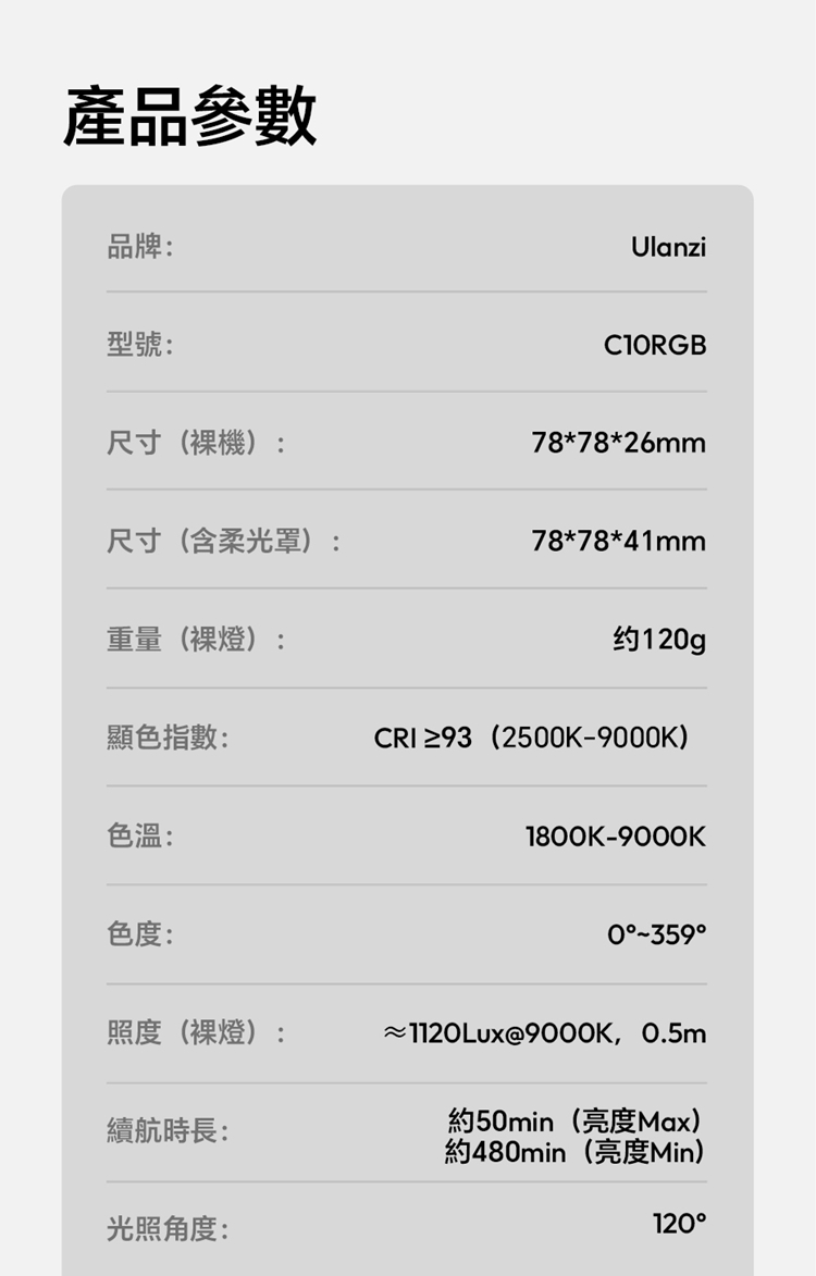 ULANZI C10RGB 是一款集高亮度與豐富色彩於一身的10W口袋型RGB補光燈。其核心亮點在於內建了多種專業光效模式,包括閃電、電視、警車等動態效果,並支援自訂RGB全彩色彩調整(360°色相及0-100%飽和度),能輕鬆營造各種創意氛圍。產品採用高顯色性LED,CRI≥95,TLCI≥96,確保色彩還原真實。燈具雖小巧便攜,但亮度出色,最高達1000流明,並提供1%-100%無級調光。它擁有直觀的OLED顯示螢幕,操作一目了然。內建2600mAh大容量電池,支援Type-C快充,並能作為行動電源為手機等設備充電。隨附的柔光罩可讓光線更柔和,加上磁吸設計、1/4英寸螺孔和多種配件,使其成為行動拍攝、直播、影片創作的強力隨身工具。
