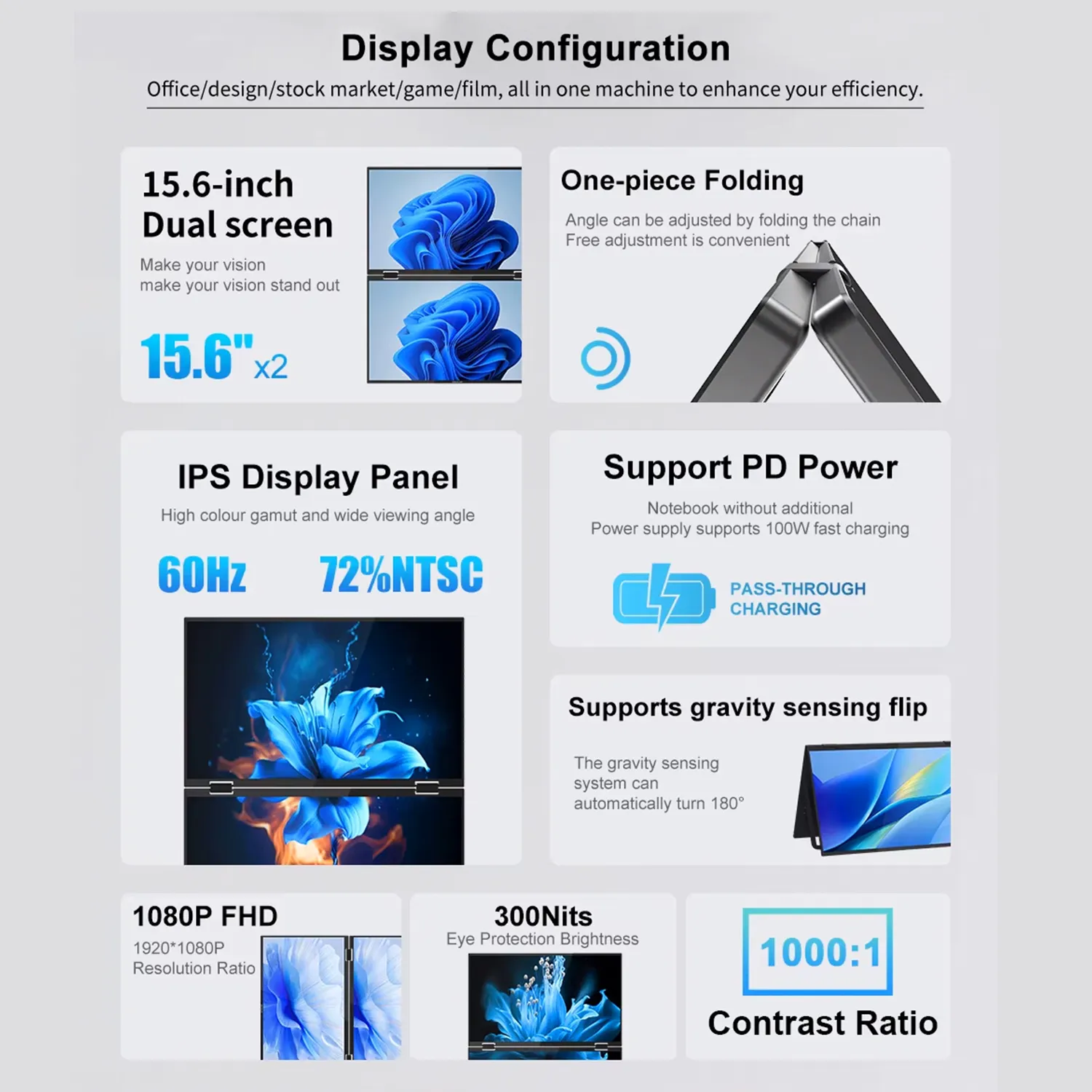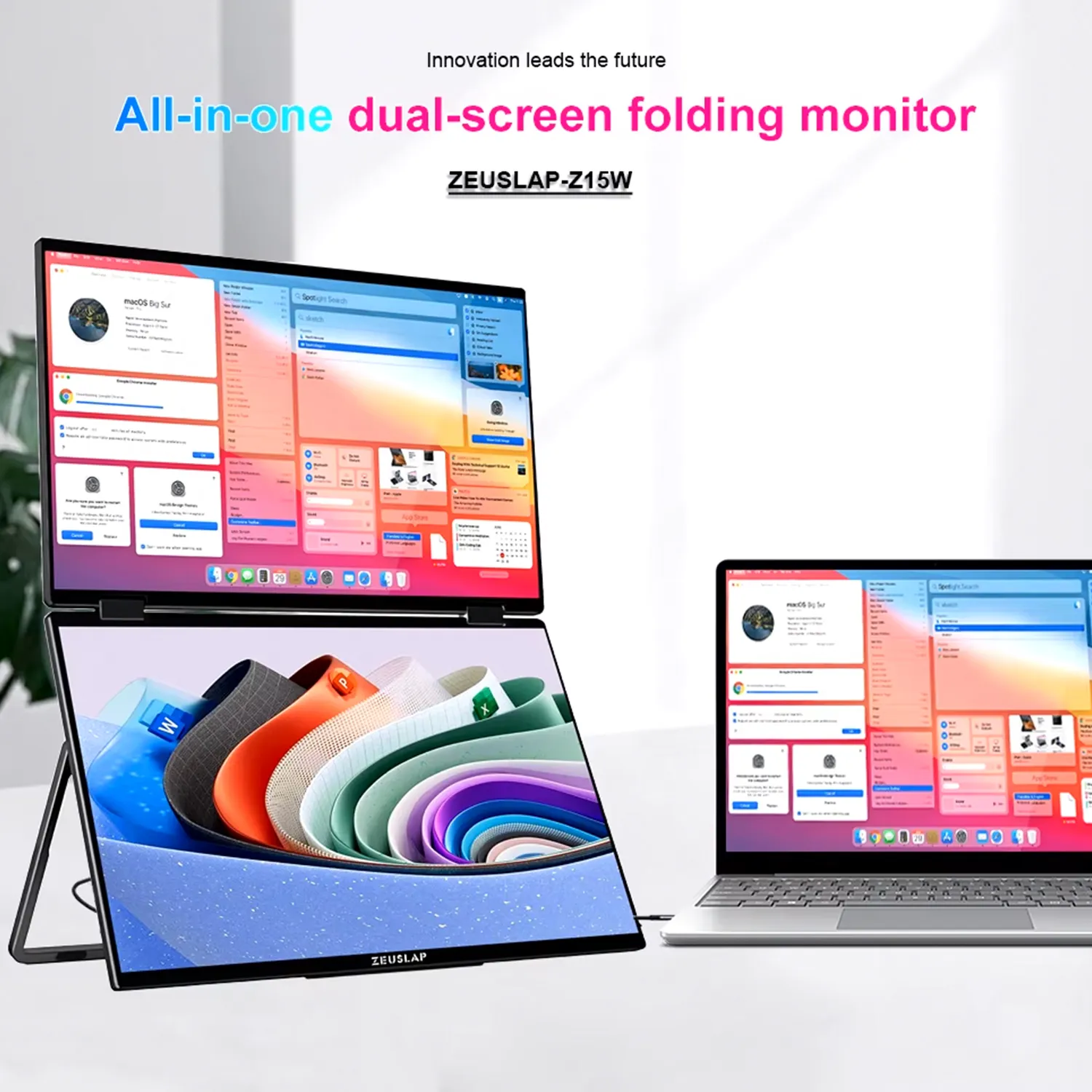 ZEUSLAP Z15W 配備兩塊 15.6 吋 IPS 螢幕,解析度達 1920×1080P FHD,支援 HDR10 效果與 60Hz 更新率,擁有 100% sRGB、72% NTSC 高色域及 178° 廣角視角,精緻度視覺體驗。內建雙喇叭,滿足影音需求。介面方面,支援 HDMI、Type-C 3.1 及 Thunderbolt 3,可連接筆記本、PS4/5、Xbox、Switch 等設備,且支援 65W PD 反向充電。具備鏡像、分割畫面、全螢幕多顯示模式,適配多工處理場景。產品採用一體成型折疊設計,輕巧易攜,適用於咖啡廳、辦公室、旅程等場景,無需複雜安裝,連接後即可擴展視覺空間,提升工作效率與娛樂體驗,是專業人士與數位游牧族的實用工具。