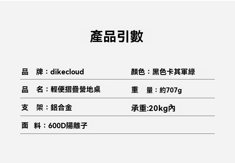 這款露營桌,輕量便攜僅約 707g,摺疊後適用登山、釣魚、野餐等場景,組裝簡單老少皆能操作。桌身選用 600D 牛津布(透氣耐磨、抗撕裂易清洗,包覆性強不易起皺),搭配鋁合金支架,堅固耐用且承重達 20kg。細節上配備支架 / 桌面固定卡扣、防倒插泥腳套,縫線工整不漏線頭,兼具實用與品質,黑 / 卡其 / 軍綠三色可選,是戶外出行的實用好物。