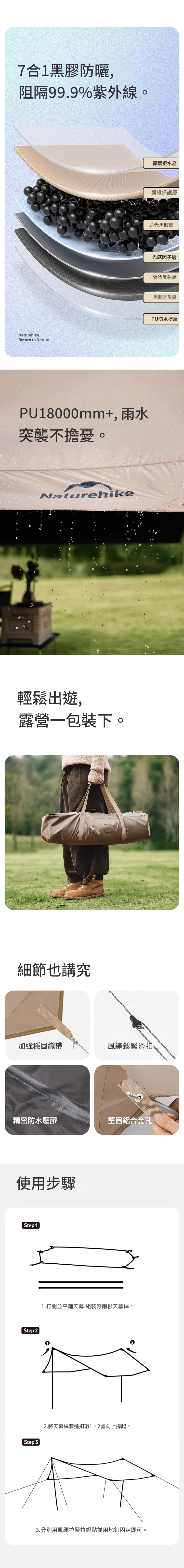 • 配件:短風繩×6、長風繩×4、天幕杆×2、捆綁帶×1、天幕×1、杆袋、收納袋×1