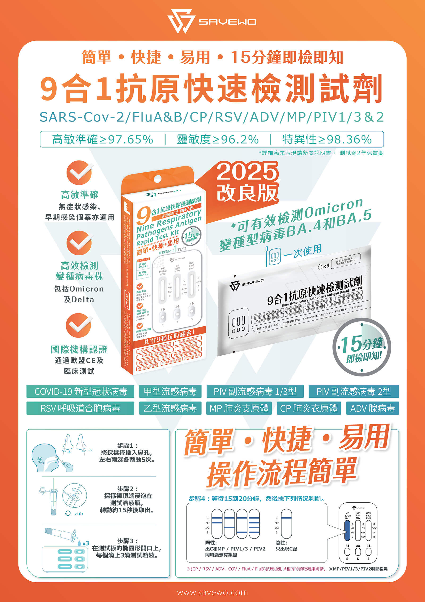 Buy SAVEWO 九合一抗原快速檢測試劑 *二十支裝* (新型冠狀病毒(Covid-19) / 呼吸道合胞病毒(RSV) / 甲型流感/ ⼄型流感/ 腺病毒/ 肺炎支原體/副流感1/3型/副流感2型/肺炎衣原體) price in outletexpress .com Hong Kong.In promotion and sale.