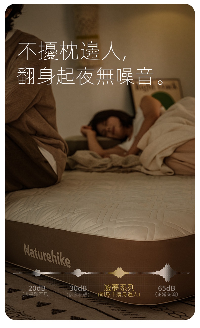 Naturehike遊夢拉絲布充氣床墊,讓您輕鬆享受戶外舒適睡眠。採用親膚桃皮絨面料,搭配聚酯纖維和PVC材質,提供柔軟與支撐兼備的睡感。床墊具備強承重能力,數萬根強力拉筋確保穩定不凹陷,翻身無噪音,不擾枕邊人。它能夠釋壓減震,適合各種體型。而內附可拆卸床笠,方便機洗打理。配有星旋大功率電動充氣泵,可快速充氣,輕鬆收納,是戶外旅行的理想選擇。