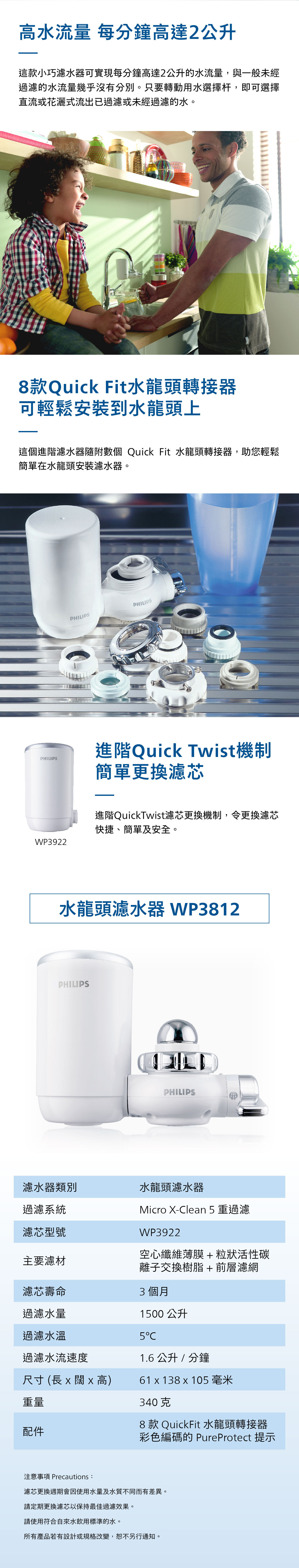Philips WP3812 + WP3922水龍頭濾水器+濾芯組合,是提升居家用水品質的實用好物。其中,WP3812濾水器配備8款QuickFit水龍頭轉接器,安裝便利。它採用四重過濾系統,過濾精度達0.01微米,能有效除菌99.99%、除氯>75%,去除泥沙、鐵鏽、有機懸浮物等多種雜質,每分鐘水流量高達2公升。搭配的WP3922濾芯,主要濾材有空心纖維薄膜、粒狀活性碳等,濾芯壽命為1500公升或約3個月。有了這個組合,洗菜、煮飯、喝水更安心,守護全家健康 。
