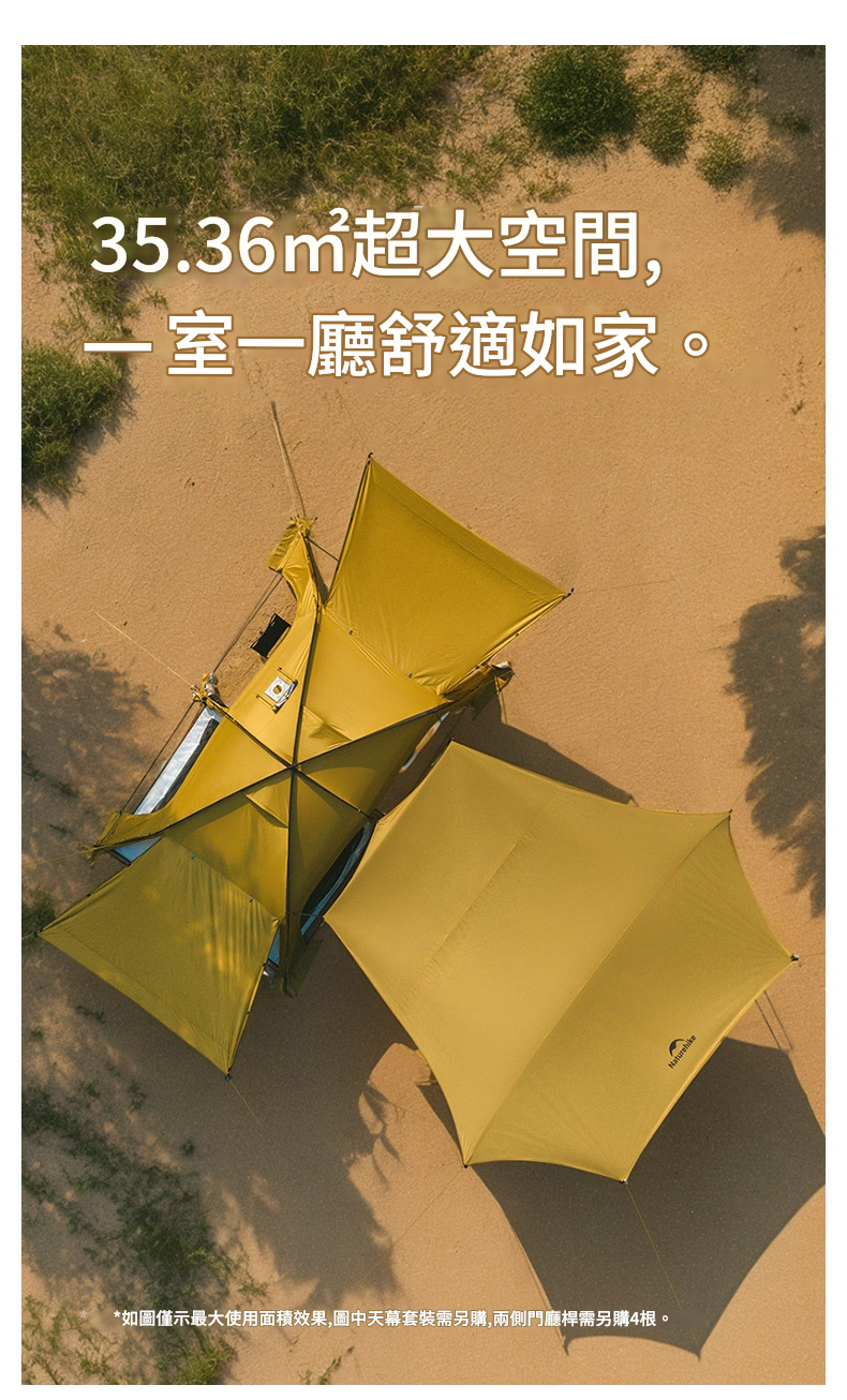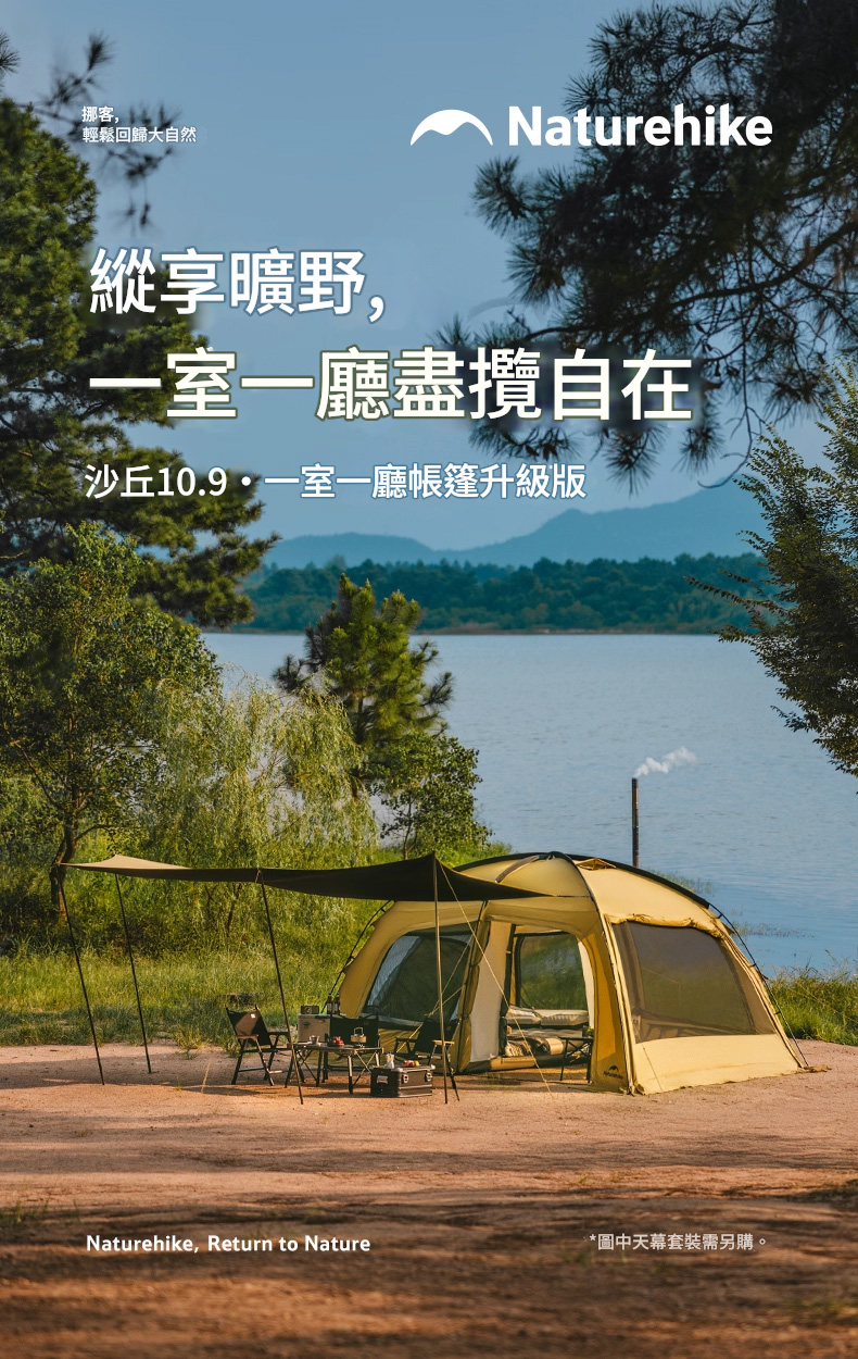 Naturehike 沙丘10.9 一室一廳露營帳篷系列,以 35.36㎡ 的超大空間 重新定義舒適露營。帳篷採用一室一廳的寬敞佈局,無論是家庭出遊或好友同行,都能享受如家般的自在與隱私。