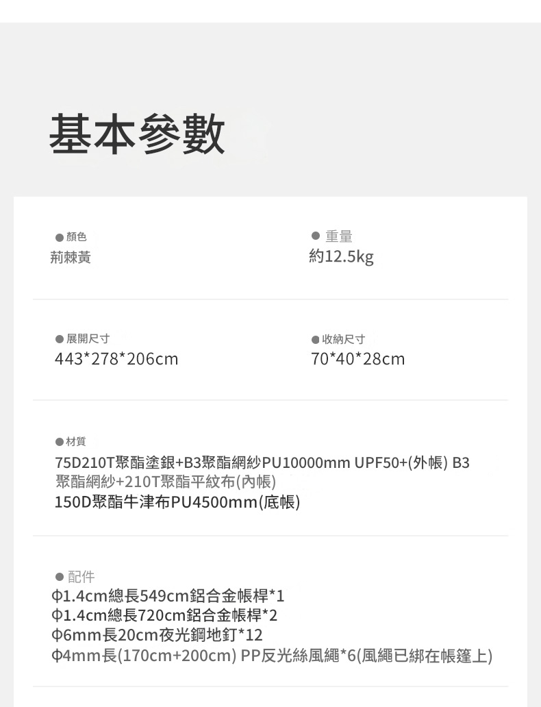 • 天幕:150D牛津布黑膠