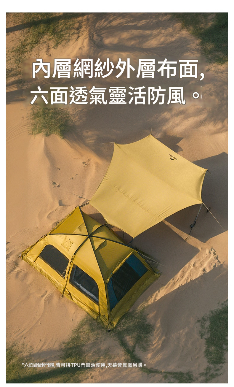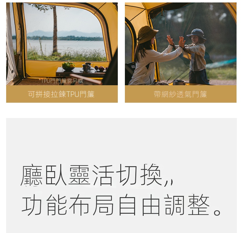 無論是連接天幕拓展遮陽空間,還是透過 大、小TPU門(選配) 實現雨雪天觀景自如,沙丘10.9 都能讓您以更自由、更愜意的方式,擁抱自然,享受每一刻露營時光。
