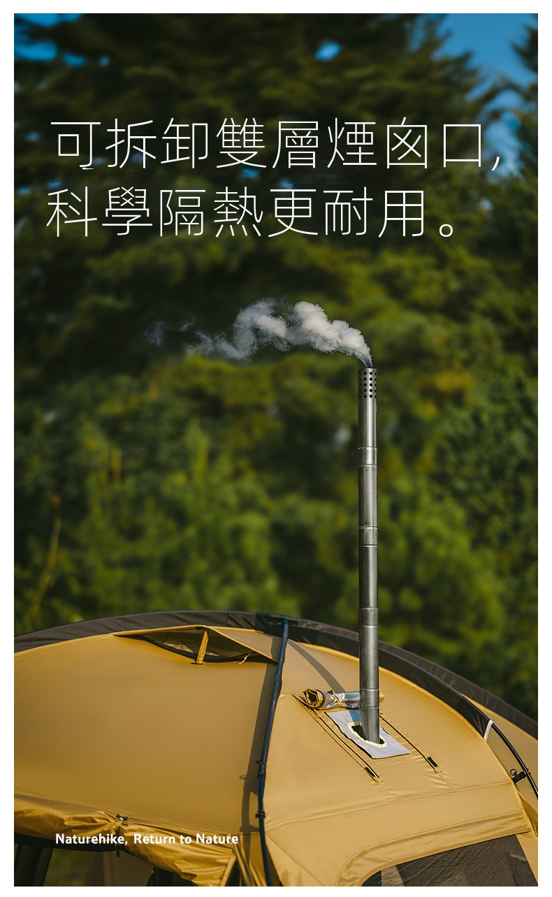 在舒適性上,帳篷採用 內層網紗外層布面 的雙層設計,六面立體通風,兼具透氣與防風性能。可拆卸雙層煙囪口 則進一步強化隔熱與耐用表現,適合長時間露營使用。
