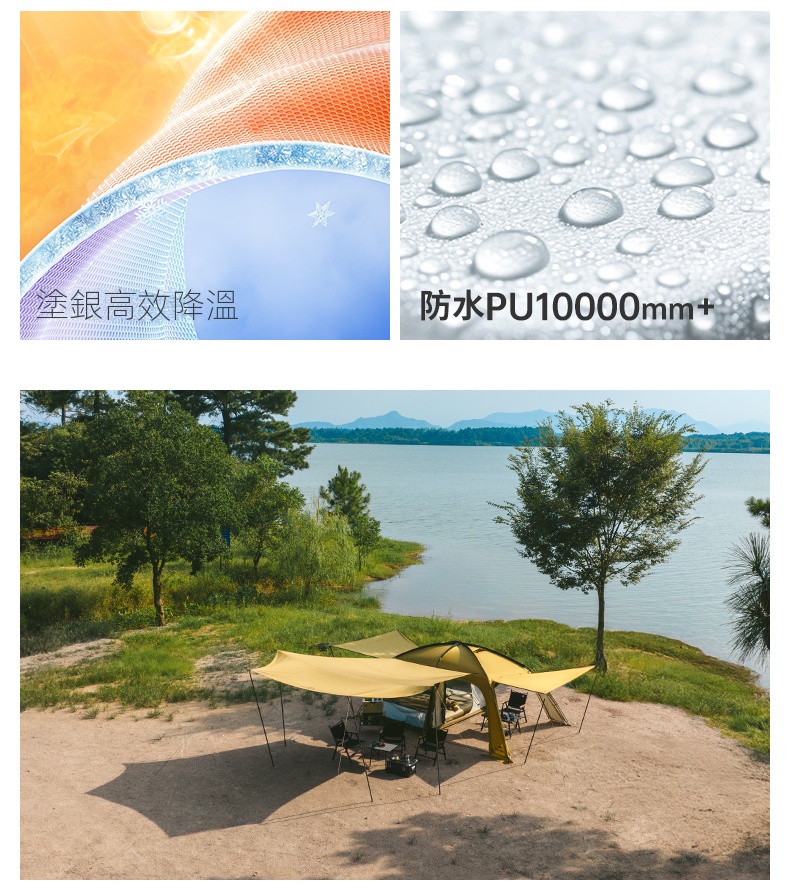 防護力同樣出色:配備 黑膠天幕,提供 UPF50+ 高效防曬,無懼陽光直射;帳內塗銀層同樣達到 UPF50+ 紫外線阻隔,全天候守護戶外休憩的舒適與安全。