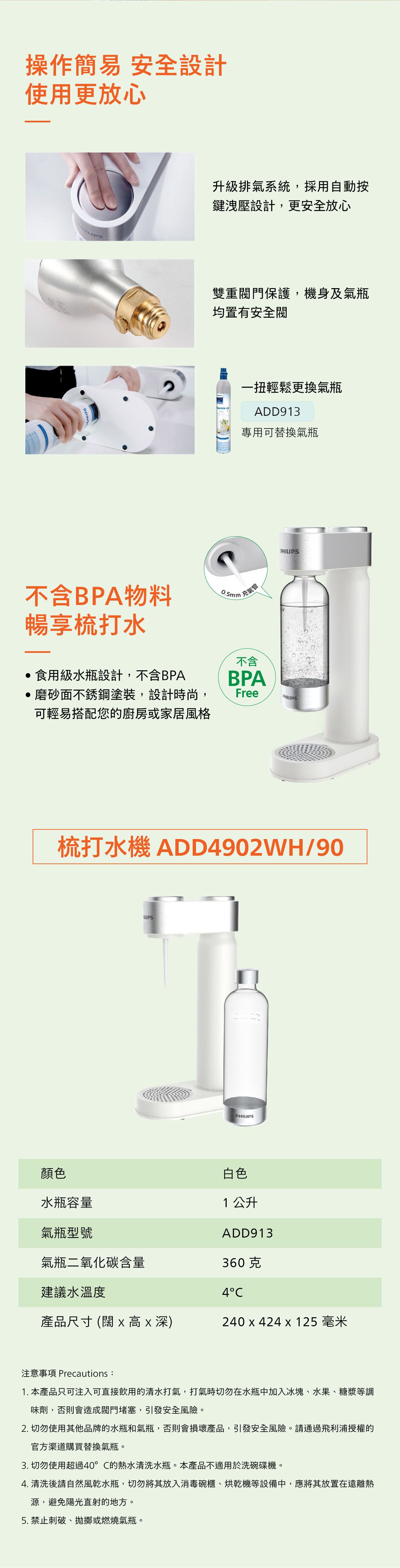 Philips ADD4902WH 家用梳打水機 - 白色 | 自動洩壓安全閥 | 無需接電 | 香港行貨