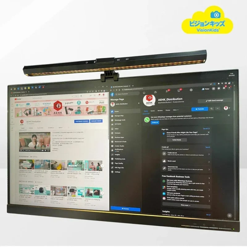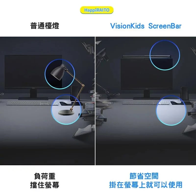 VisionKids HappiRAITO 智慧護眼螢幕掛燈,專為夜間工作學習人士設計,適配 1-3CM 厚度、上邊框寬度 5 毫米及以上的顯示器(無框或曲面顯示器可能不適用)。採用高品質 SMD 3014 LED 光源,光色均勻,搭配黑色鋁合金外殼,散熱好且不易變形。支援 3 種色溫(3000K 暖光、4000K 自然光、6000K 日光)和 9 級亮度調節,觸控按鍵操控便捷,也具備記憶功能,能自動恢復上次使用亮度。非對稱光學設計可避免光線反射到螢幕產生眩光,USB 供電(需 1A 以上電源),1.5 m USB 轉 Type C 線適配多種供電設備。懸掛式安裝節省空間,是電腦辦公室學習的好幫手。