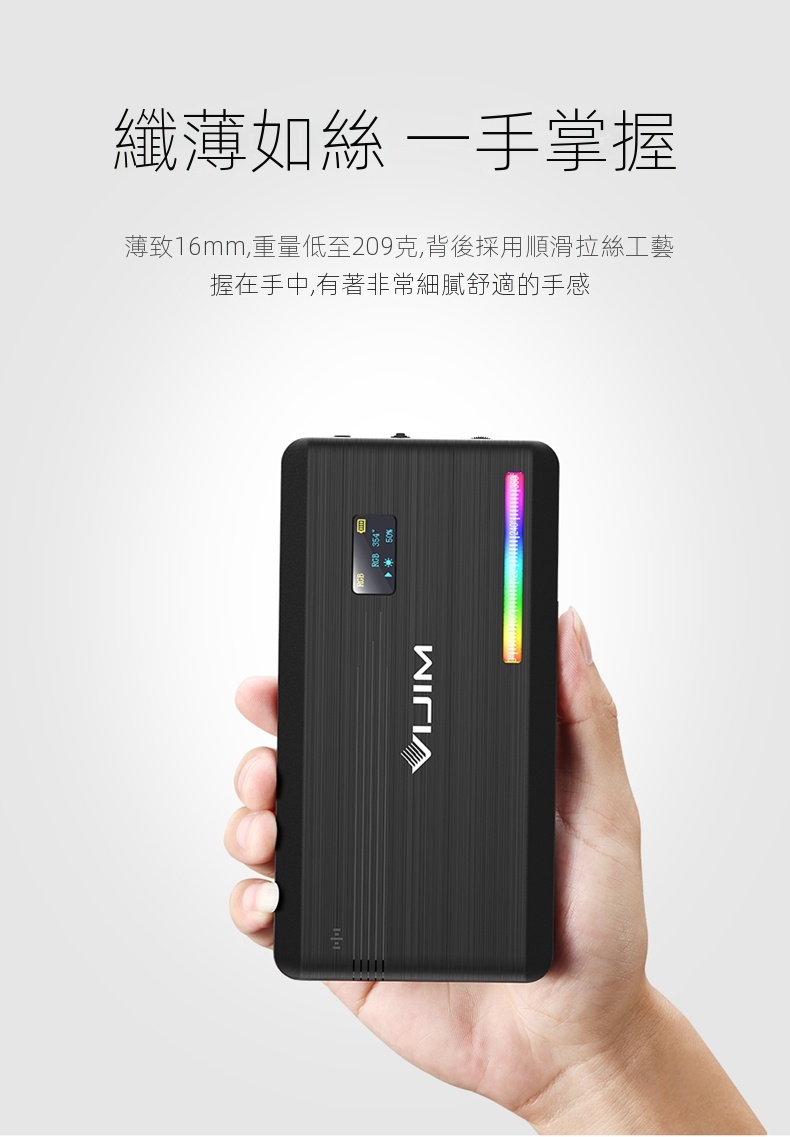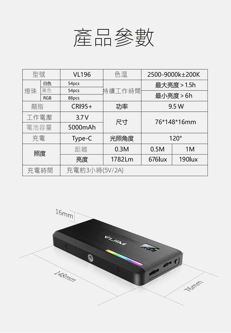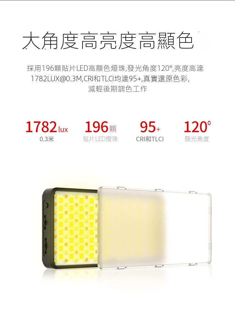 Ulanzi VIJIM VL196 RGB 补光燈是一款多功能的便攜式補光設備,專為攝影愛好者和創作者設計。其採用196顆貼片LED燈珠,提供高亮度與高顯色性,最大亮度可達1782lux@0.3M,CRI和TLCI均達到95+,確保色彩真實還原。產品支持HSI彩色模式,提供從0到360度的調色選擇,並可調整亮度,靈活滿足各種創作需求。 VL196擁有寬廣的色溫範圍(2500K-9000K),適合多種場景應用,包括人物攝影、光繪攝影、靜物拍攝布光、戶外直播補光以及場景特效塑造。此外,它配備了20種創意光效模式,如警車、閃電、派對等,讓用戶輕鬆打造獨特的光影效果。 產品內置5000mAh大容量鋰電池,支持邊充邊用,續航時間長達1.5-6小時。同時,配有硅膠柔光罩和蜂巢聚光罩,進一步豐富光線效果。