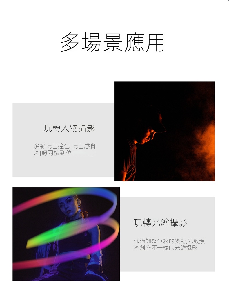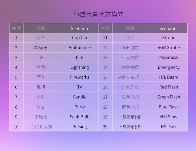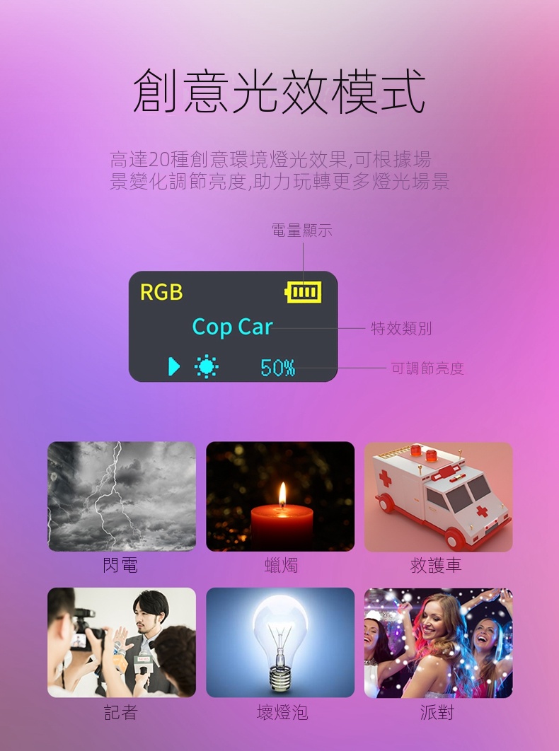 • 配備20種創意光效模式,包括警車、閃電、派對等特效