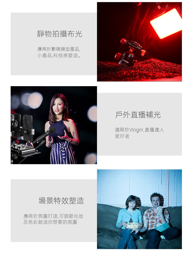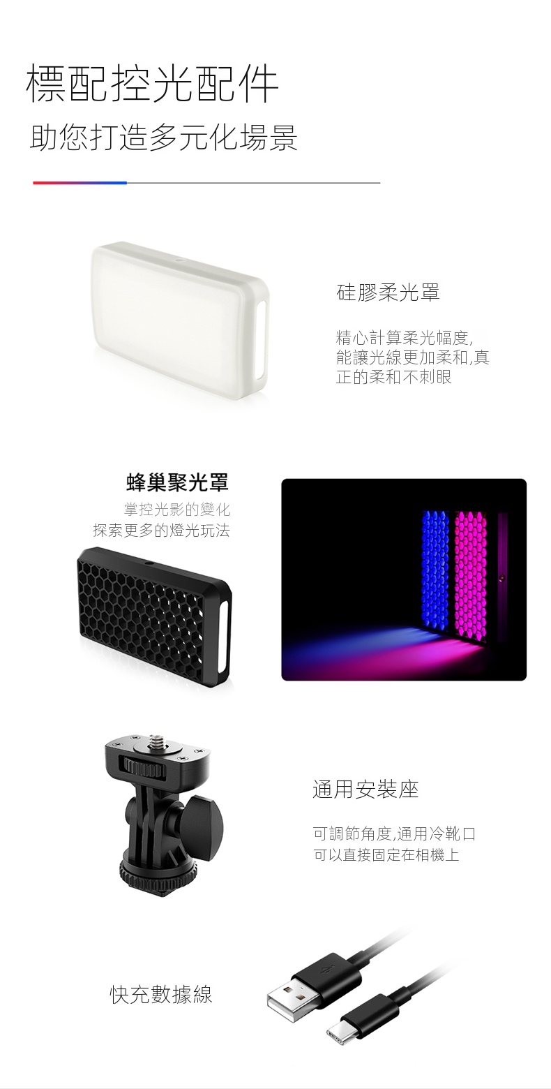 • 提供硅膠柔光罩與蜂巢聚光罩,豐富光線效果