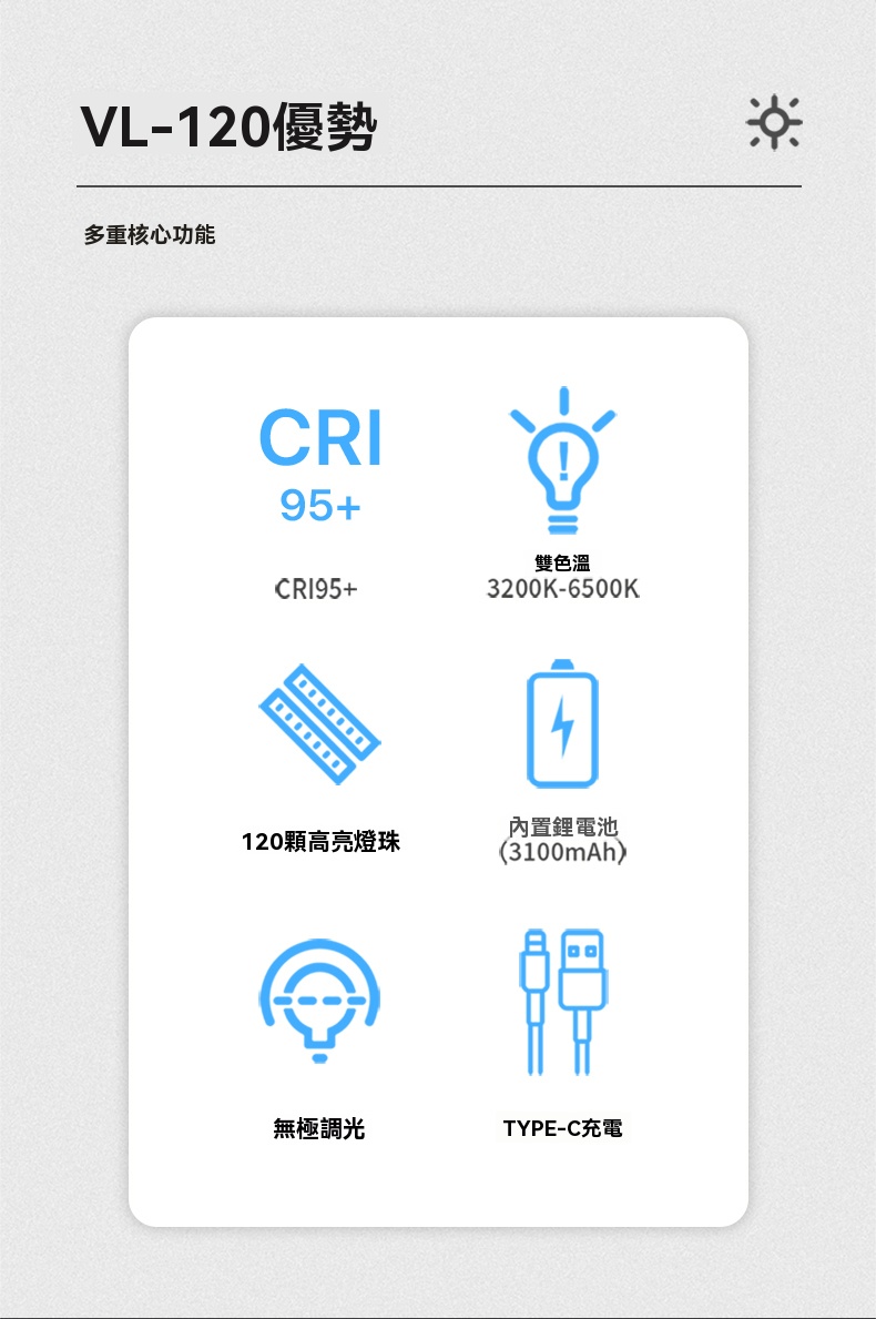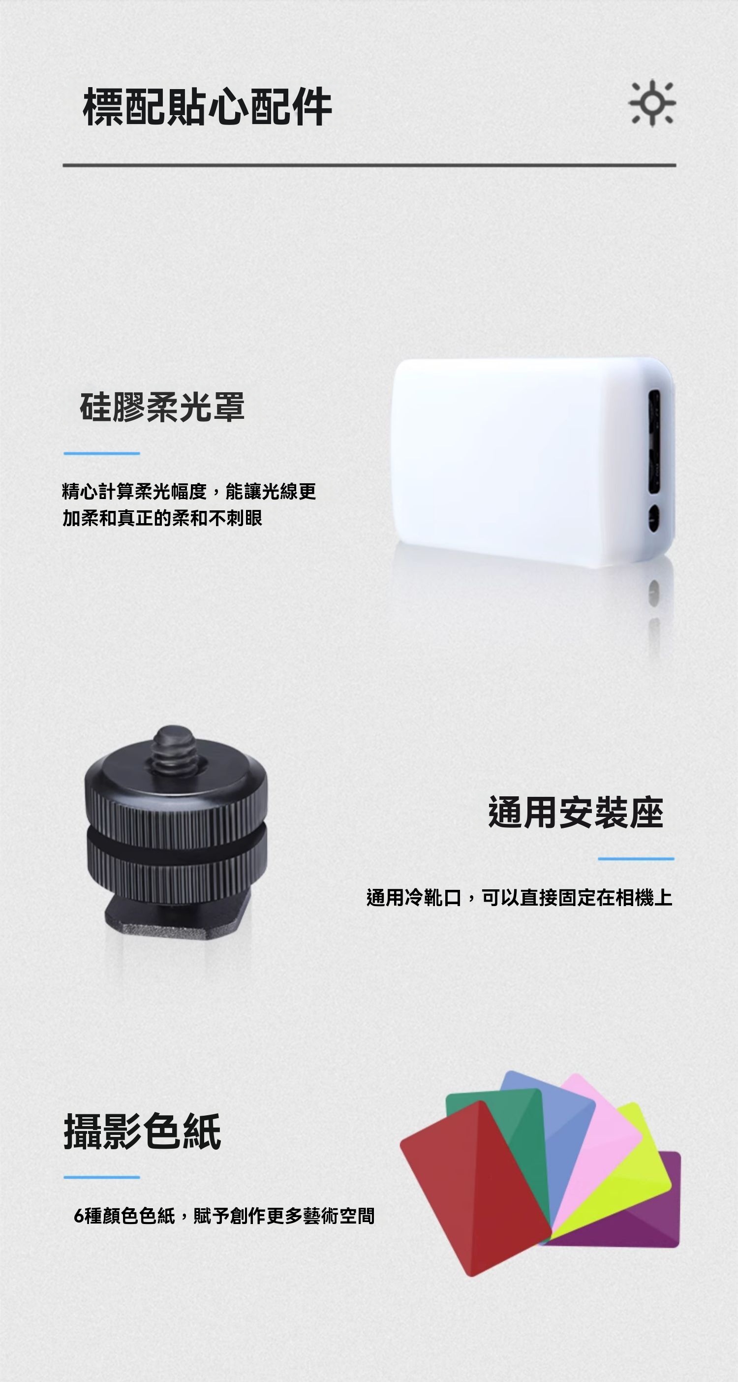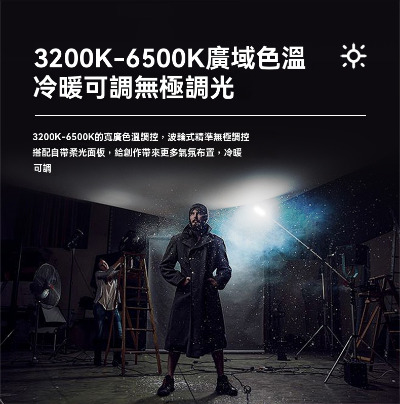 • 雙色溫設計(3200K-6500K),可無極調節,滿足多種攝影需求。