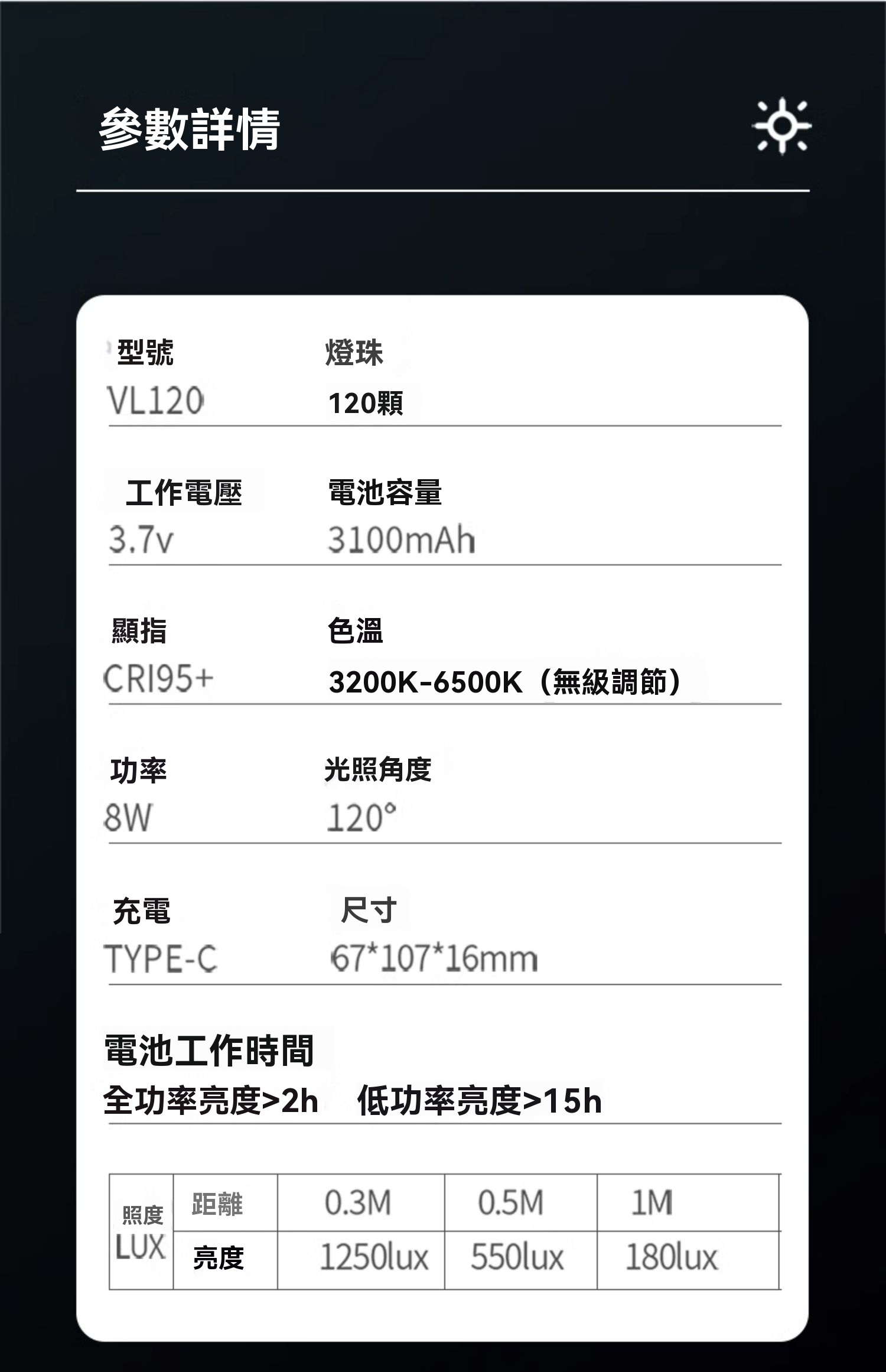 • 120顆高亮SMD貼片燈珠,亮度高達1250Lux,光照角度120°。