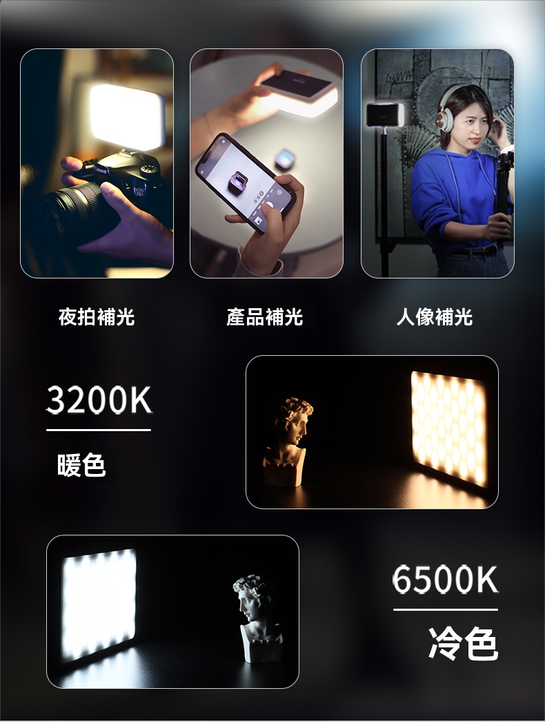 • 適用於夜拍補光、產品展示和人像補光等多種場景。