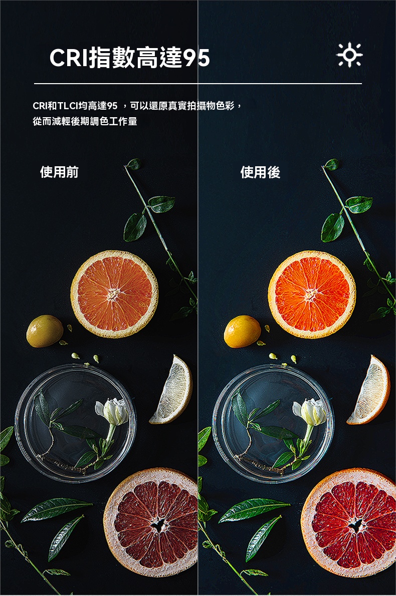 • CRI顯指高達95+,還原真實色彩,減少後期調色工作。