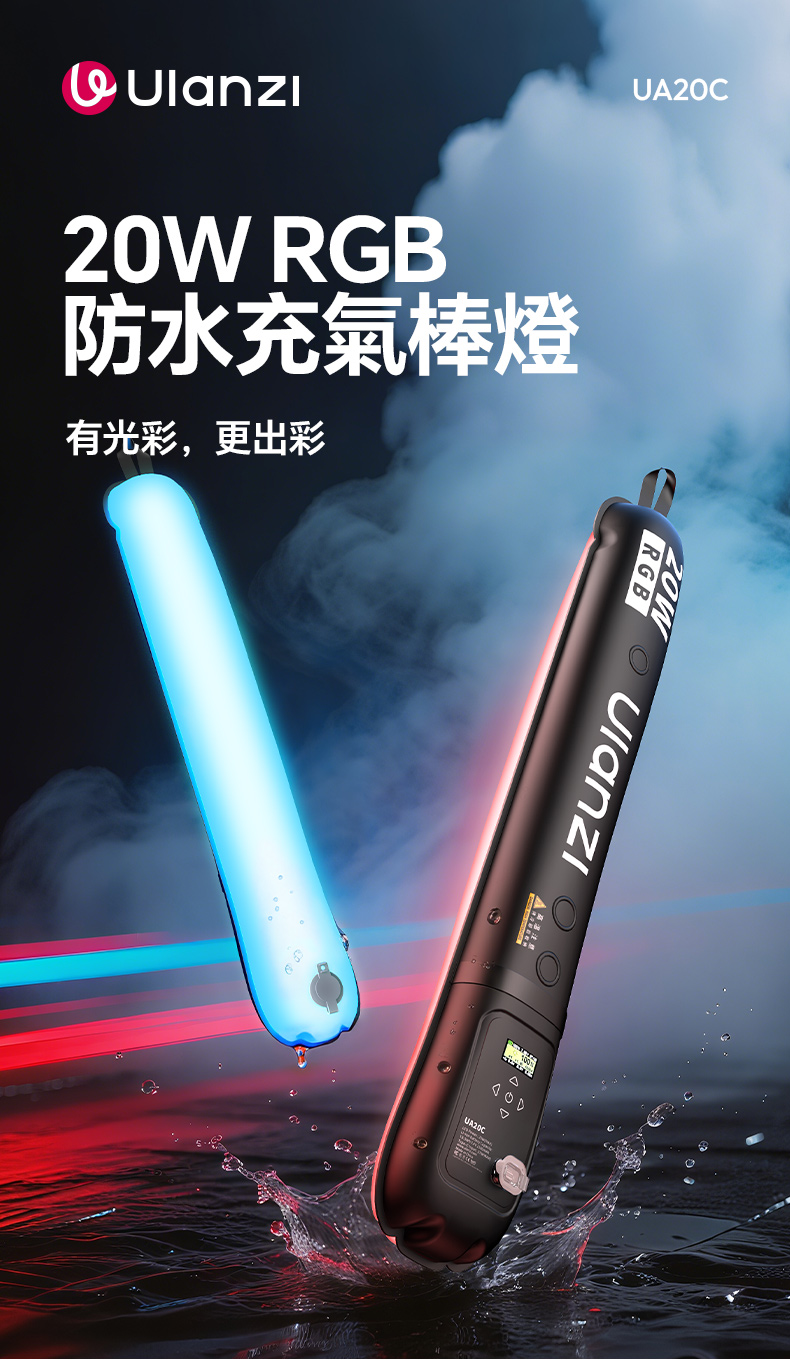 Ulanzi UA20C 20W RGB 防水充氣燈棒,憑藉靈活特性與專業光效,適用多場景拍攝需求。它採用 TPU 材質,不僅耐磨防汚,還支援防濺水設計;內置 3 枚 N52 磁石,可輕鬆吸附於鐵製支架或配件,讓拍攝與佈光時能解放雙手。燈棒輸出 20W 高功率,色溫覆蓋 1800K-10000K 廣範圍,調光範圍 0-100%,搭配 CRI≥95 的高顯色指數,能精確還原物體真實色彩,避免色偏與畫面灰階問題。其重量僅 376g,如紙般輕薄可折疊,配備專用收納袋便於攜帶;充氣支持泵充與口吹兩種方式,應急時也能快速準備。搭載 18.5Wh 2500mAh 電池,Type-C 介面充電,最大亮度下可連續使用 55 分鐘,還有多種光效模式,輕鬆打造高品質影像。