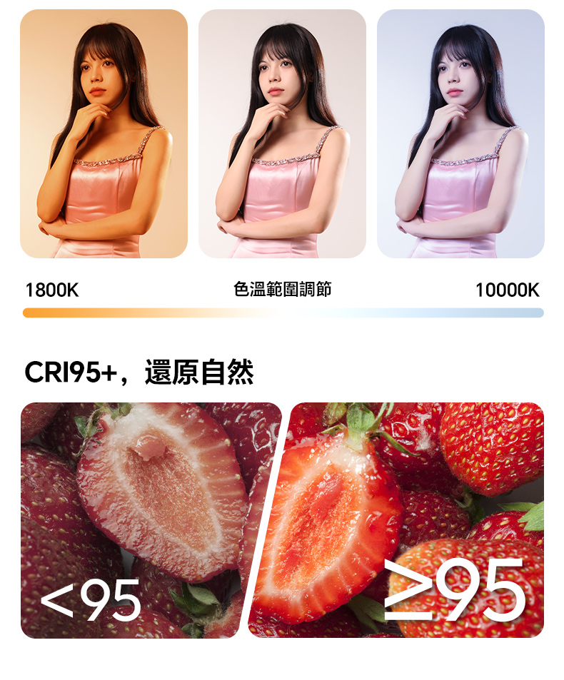 • 色溫涵蓋 1800K-10000K 廣範圍,搭配 CRI≥95 高演色指數,能精準還原物體真實色彩,避免色偏與畫面灰階問題。