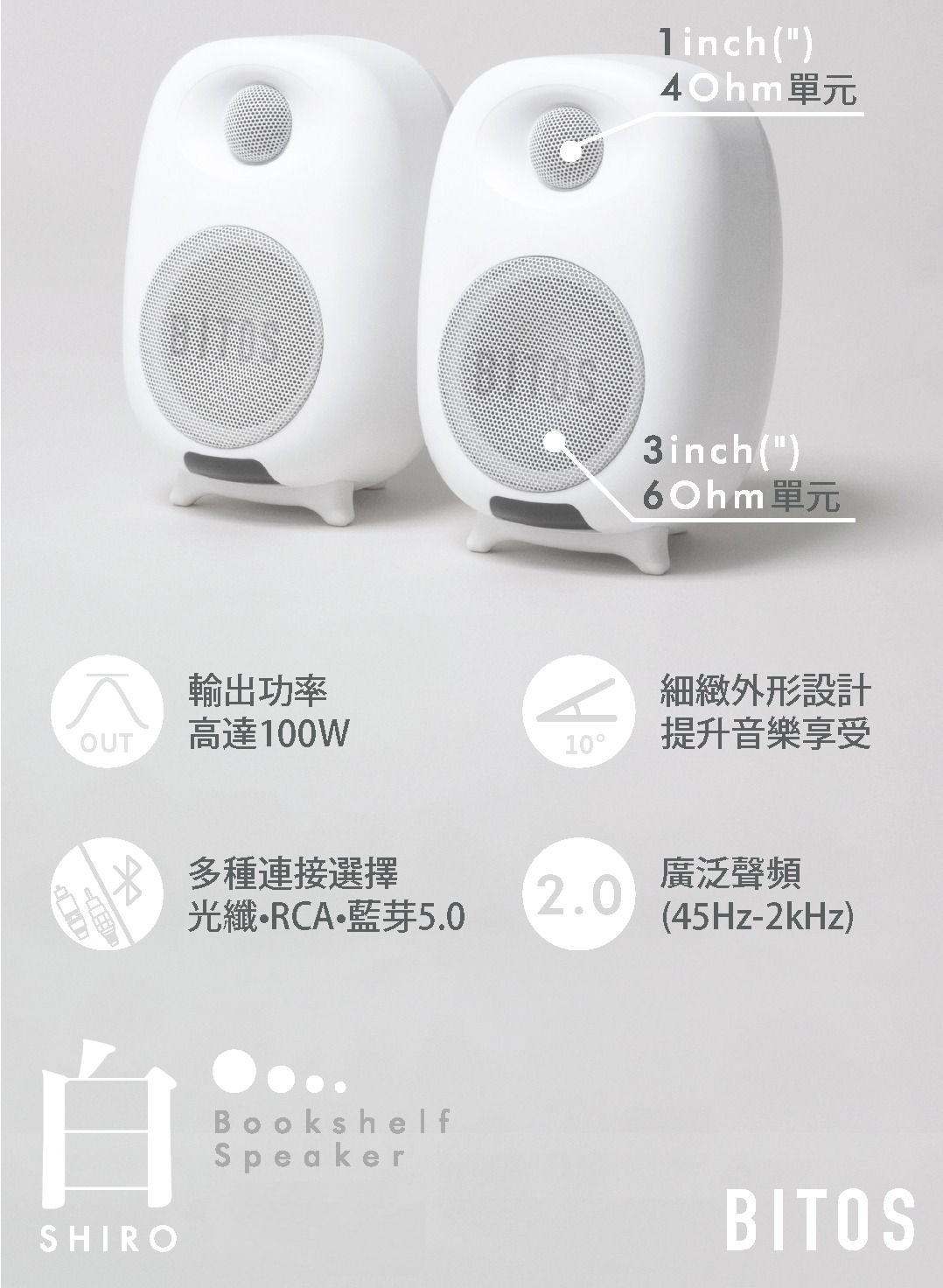 BITOS SHIRO 書架電腦喇叭 - 白色 | 無線remote遙距操控 | 雙單元涵蓋高低音域 | 香港行貨