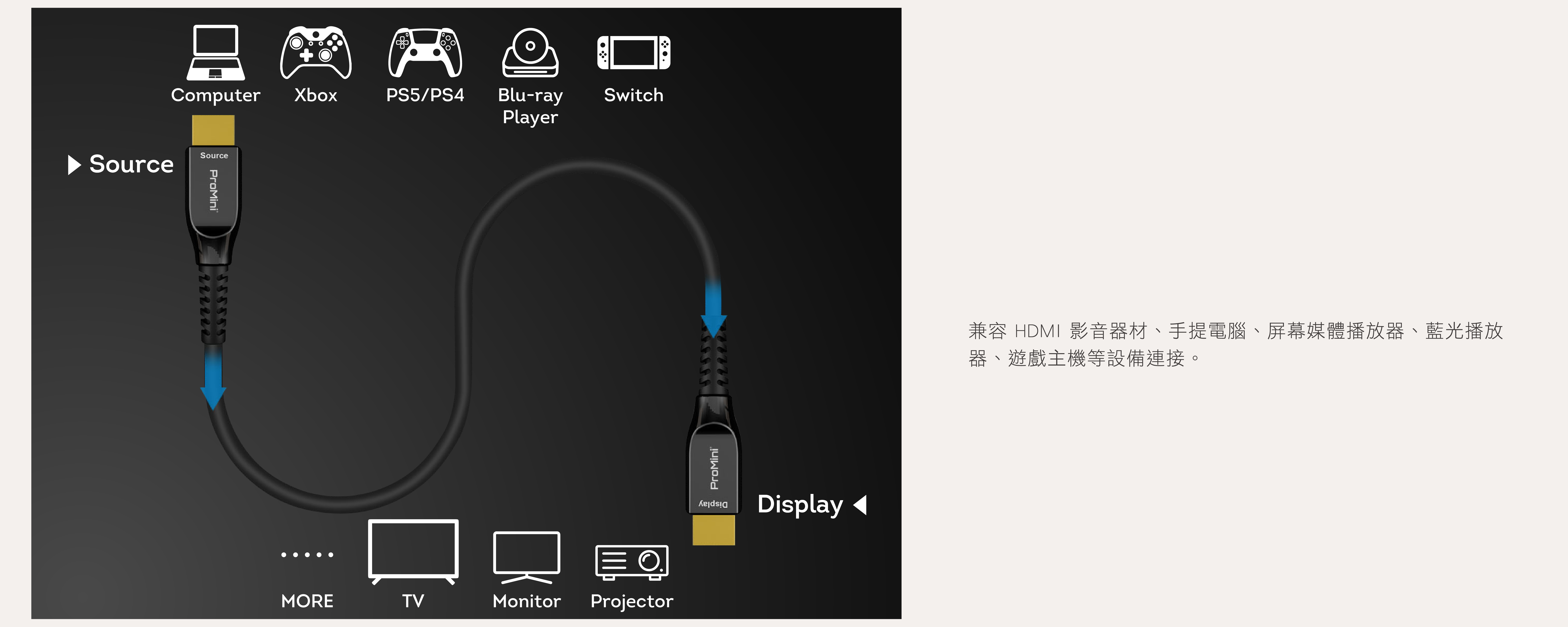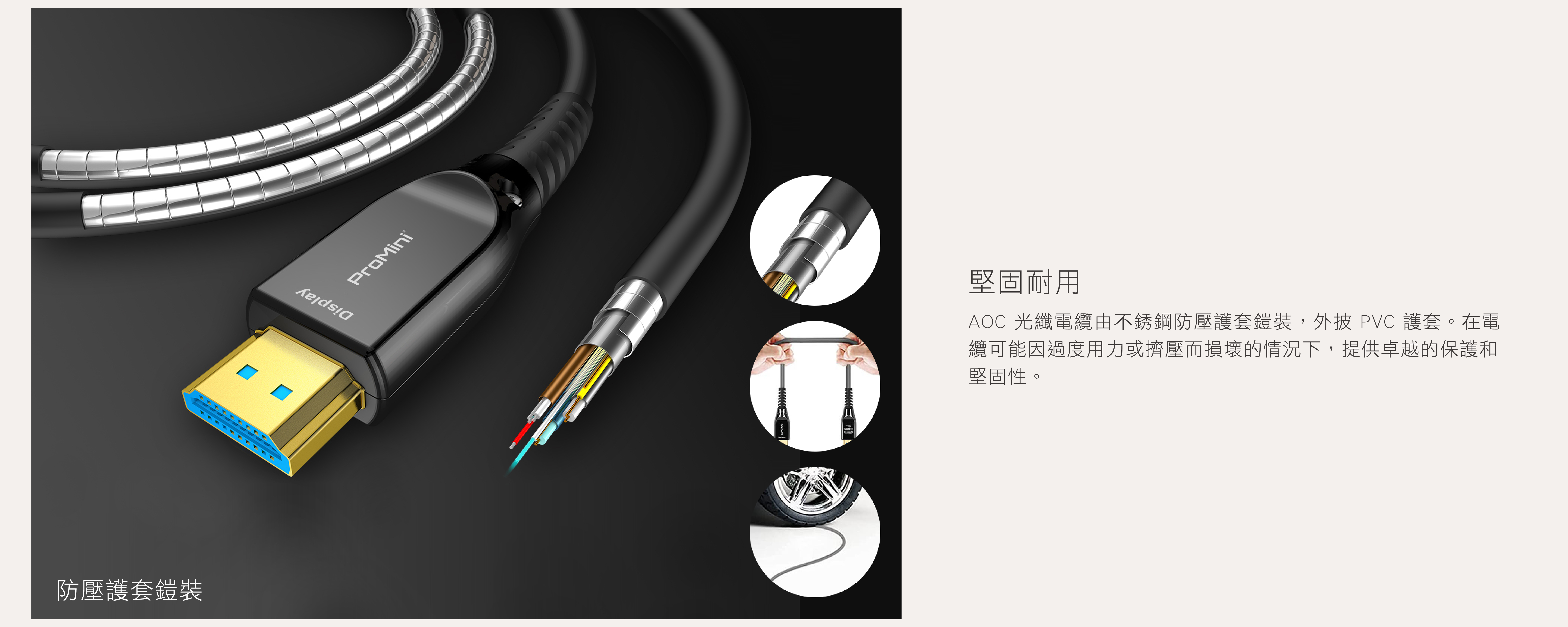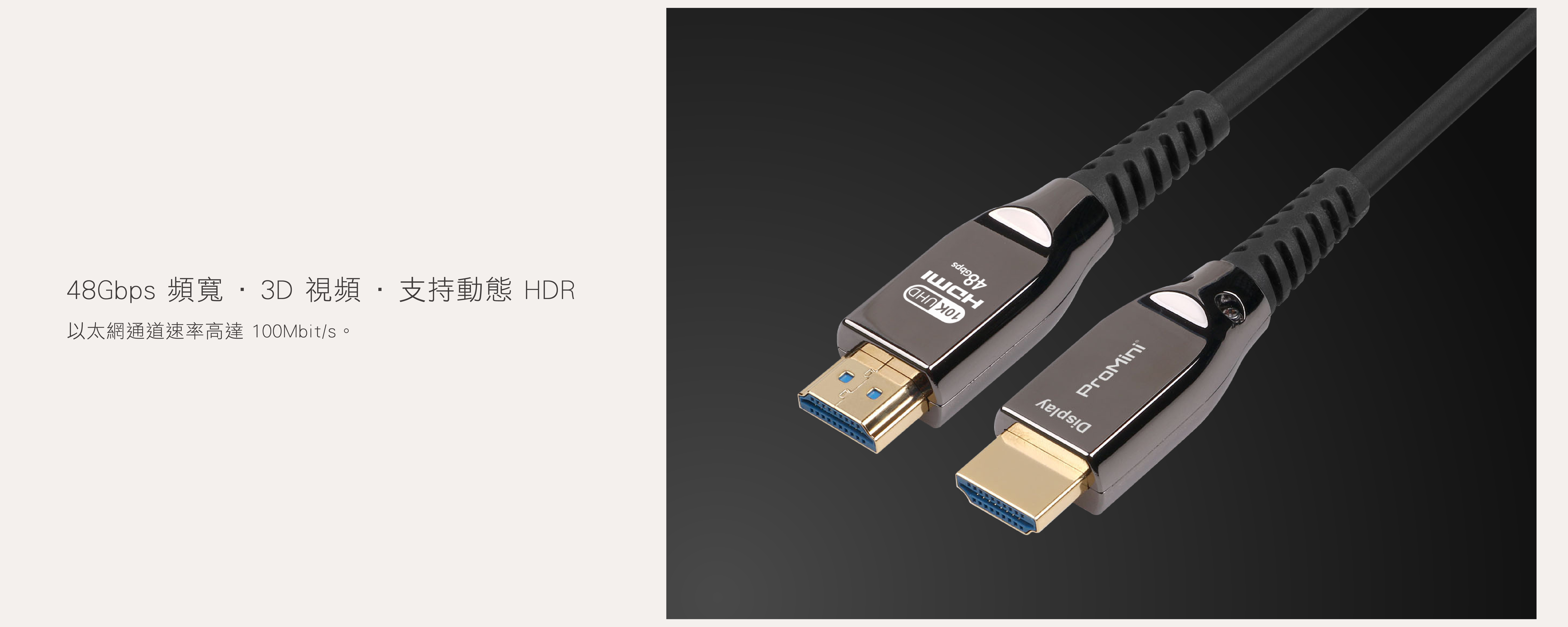 ProMini 10K HDMI 2.1 AOC光纖電纜,是一款性能卓越的高清傳輸線。它符合HDMI 2.1規範,支援HDCP 2.2版權保護協議。憑藉純光纖傳輸,可提供高達48Gbps傳輸速率,確保影像訊號無壓縮,畫質原汁原味。其可相容於DDC、CEC等多種進階訊號傳輸功能,支援最高4K@60Hz(色彩空間4:4:4)的3D視訊和深色模式。採用850nm VCSEL光電探測器,具備優異EMI防護,有效減少外界幹擾。即插即用,無需外接電源或擴大機,也支援熱插拔,使用極為便捷,是長距離無損傳輸的理想選擇 。