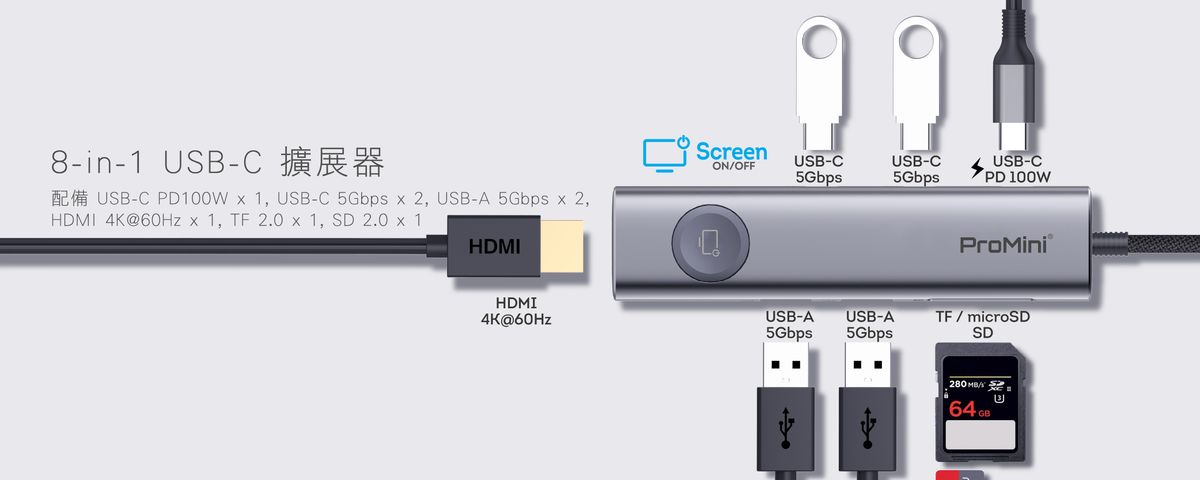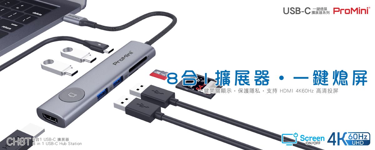 Buy ProMini CH8T 8-in-1 USB-C 擴展器 | 一鍵鎖屏 | 關閉/開啟顯示屏 | 保護私隱 | 香港行貨 price in outletexpress .com Hong Kong.In promotion and sale.