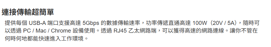 • USB-C 介面支援 100W(20V/5A)快速充電。