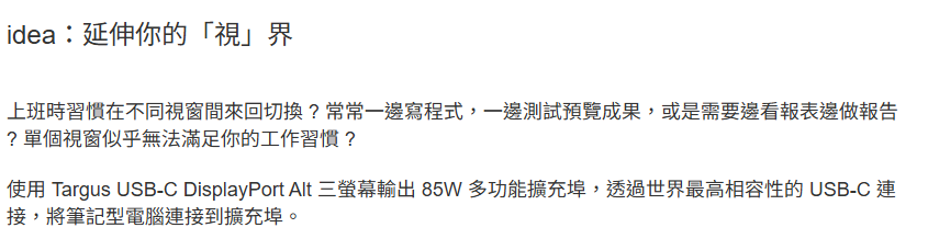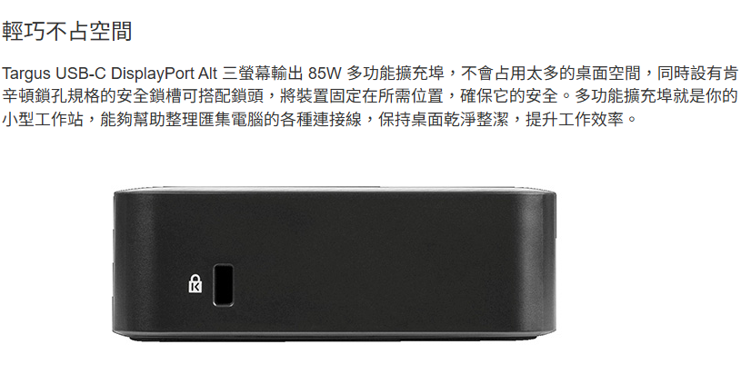TARGUS DOCK430 USB-C 85W 多功能擴充埠相容 PC、Mac、Android 設備,是提升工作效率的優選配件。它體積小巧,尺寸 18×8.2×2.7cm,重 285g,不佔桌面空間,配備肯辛頓鎖孔規格安全鎖槽,可固定設備。設備支援 85W 高功率筆記本充電,搭載兩個 DisplayPort 1.4 和一個 HDMI 2.0 端口,能同時驅動三台高清顯示器、兩台 2K 顯示器或一台 4K 顯示器。擁有四個 USB 3.0 連接埠(含一個快充口)、乙太網路連接埠及 3.5mm 音訊接口,可連接多類外接設備,附 USB-C 轉 USB-A 接頭,無 USB-C 連接埠的設備也能輕鬆相容。