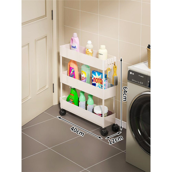 家用超薄置物推車專為夾縫收納設計,結構穩定且圓潤邊角,安全美觀。採用優質塑料製成,加厚用料確保堅固耐用。多層設計,層距加高,適合放置各類物品,如清潔劑、洗滌精等。配備靜音滑輪,360度自由移動,輕鬆推行無阻。貼心挂钩設計,不僅能塞還能掛,多功能使用更便捷,小巧不佔空間,是家庭收納的理想選擇。