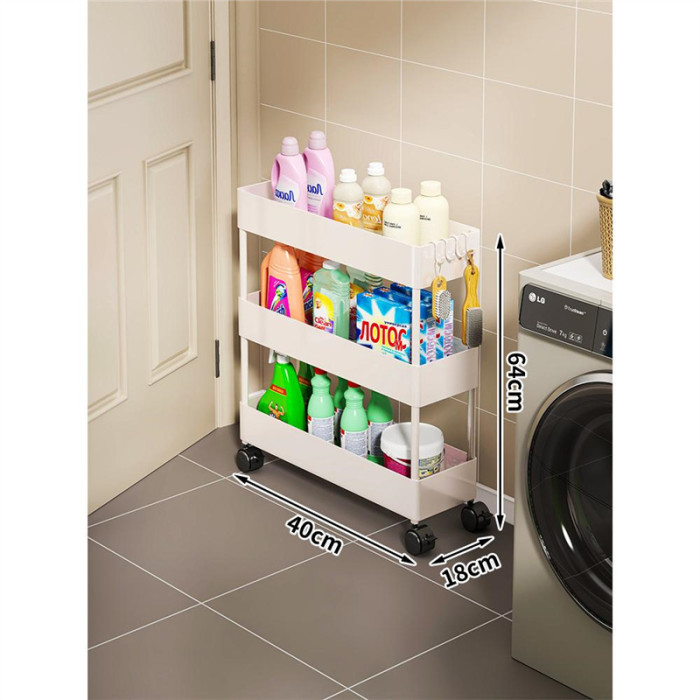 家用超薄置物推車專為夾縫收納設計,結構穩定且圓潤邊角,安全美觀。採用優質塑料製成,加厚用料確保堅固耐用。多層設計,層距加高,適合放置各類物品,如清潔劑、洗滌精等。配備靜音滑輪,360度自由移動,輕鬆推行無阻。貼心挂钩設計,不僅能塞還能掛,多功能使用更便捷,小巧不佔空間,是家庭收納的理想選擇。