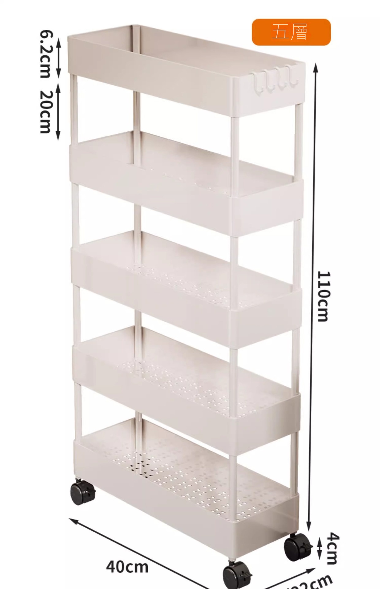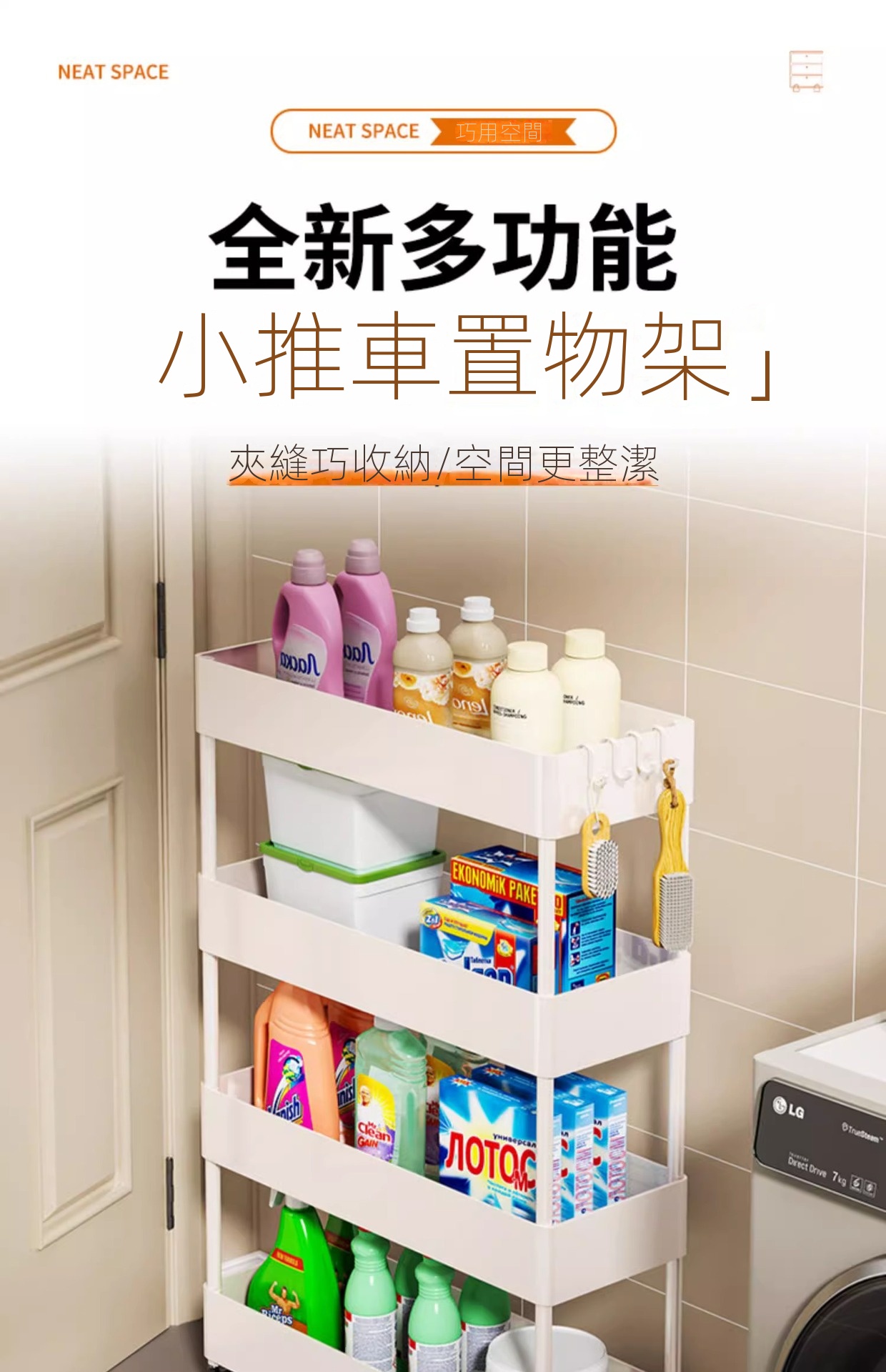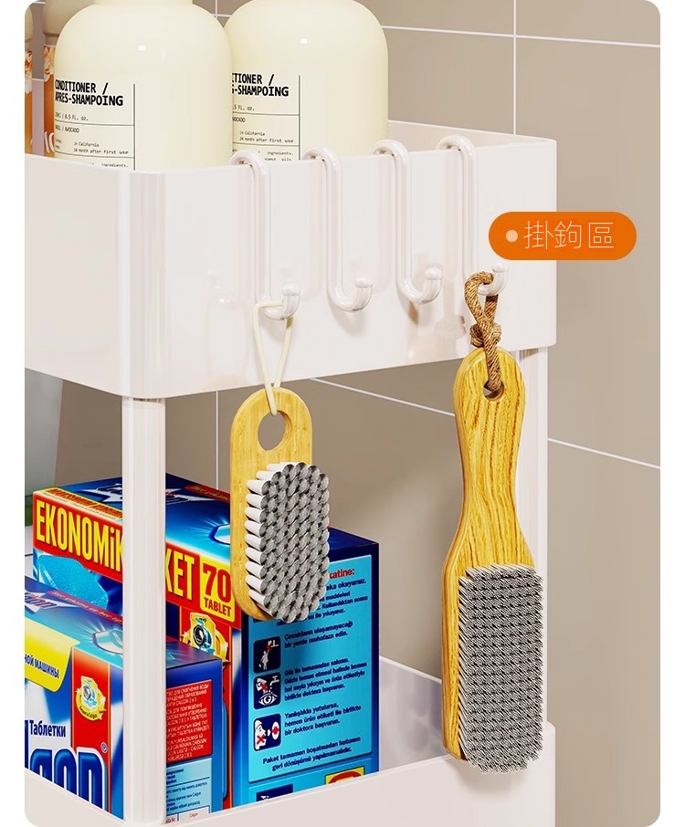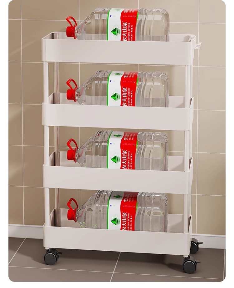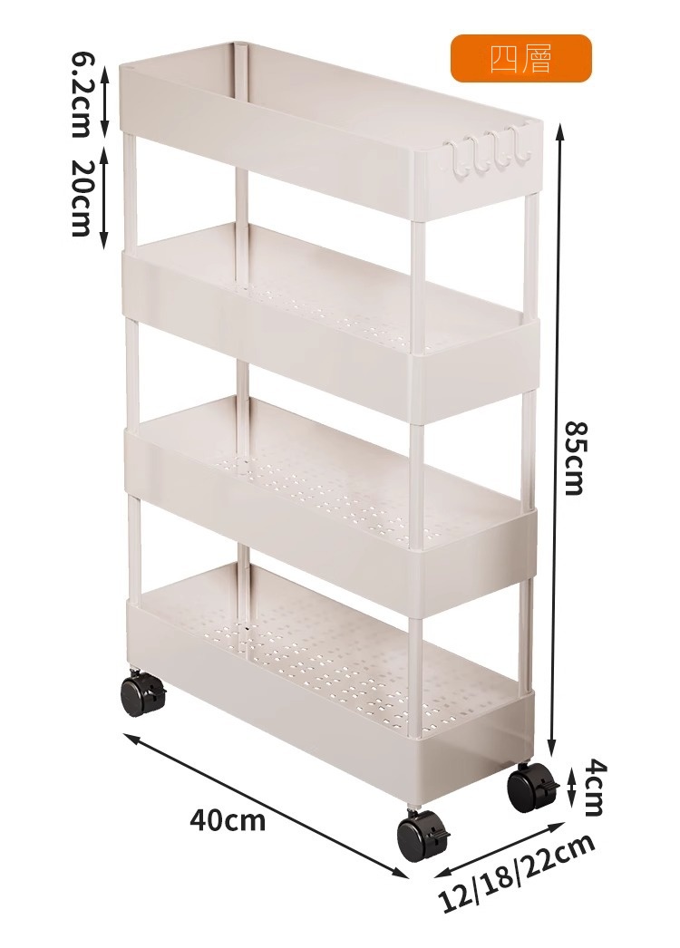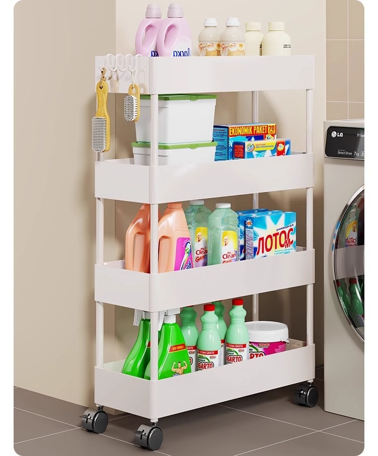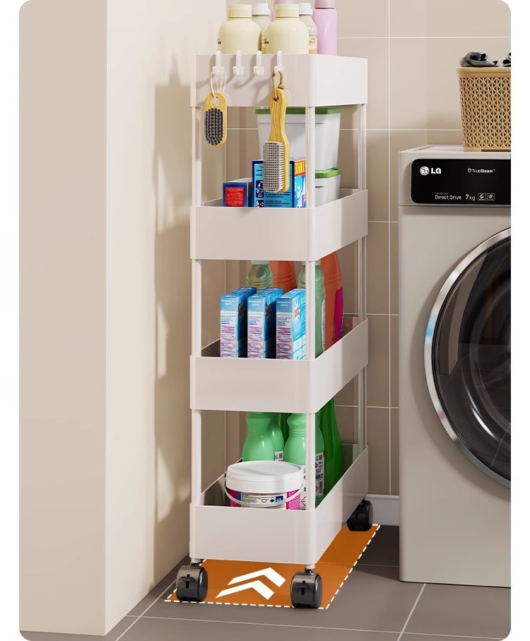 家用超薄置物推車專為夾縫收納設計,結構穩定且圓潤邊角,安全美觀。採用優質塑料製成,加厚用料確保堅固耐用。多層設計,層距加高,適合放置各類物品,如清潔劑、洗滌精等。配備靜音滑輪,360度自由移動,輕鬆推行無阻。貼心挂钩設計,不僅能塞還能掛,多功能使用更便捷,小巧不佔空間,是家庭收納的理想選擇。