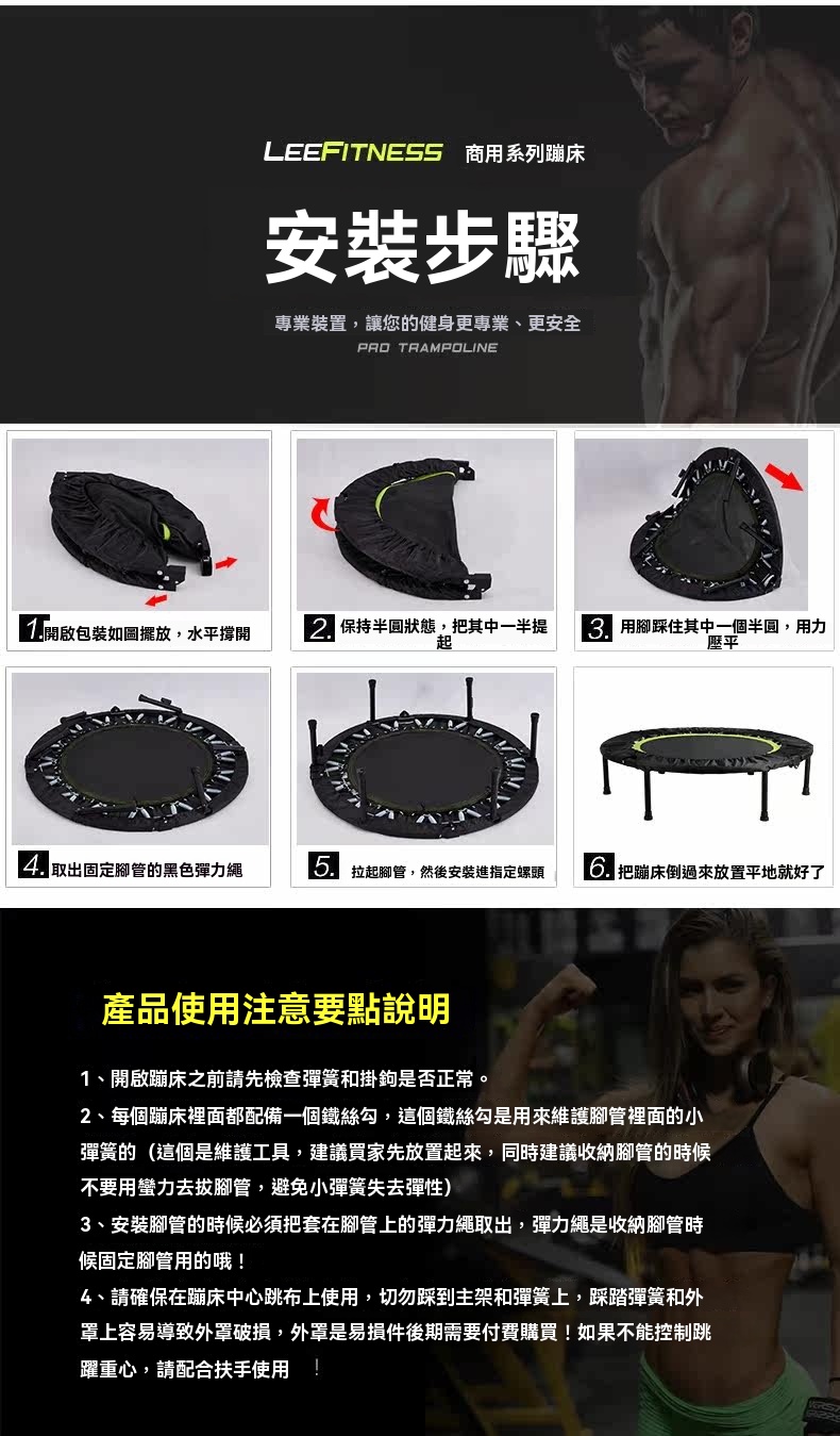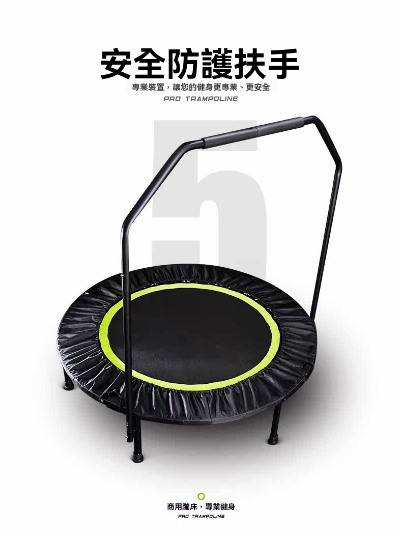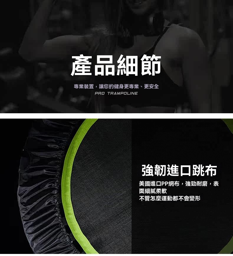 這款商用蹦床採用強韌耐磨的PP網布跳布,表面細膩柔軟,運動時不易變形。內置32根腰鼓彈簧,由3.2mm鋼絲經高溫淬火及電鍍處理製成,彈力強勁,使用壽命長。支架選用加粗加厚鋼管,搭配機械人焊接工藝,結構穩固;每根支管均配備加厚橡膠套,具防滑減震效果,可適應多種地面,減少樓層干擾。防護罩採用加厚牛津布,有效隔離金屬部件。蹦床支援四折收納,免安裝設計,收放簡便。承重可達150公斤,適合健身房等專業訓練場景,隨附彈簧維護工具及詳細安裝說明。