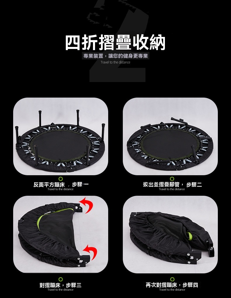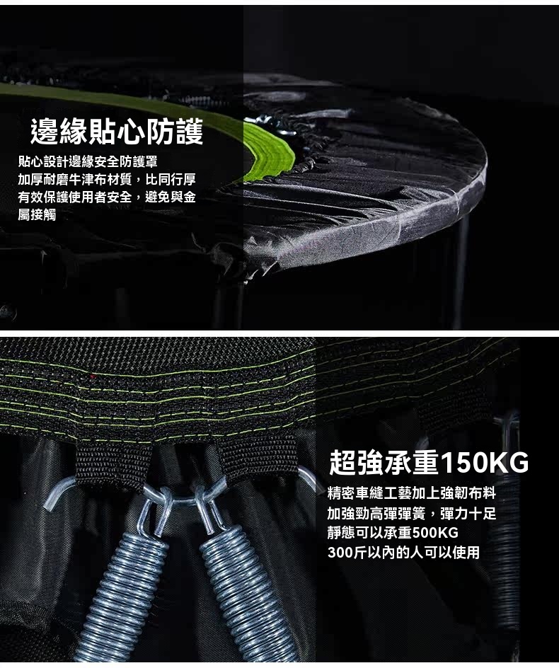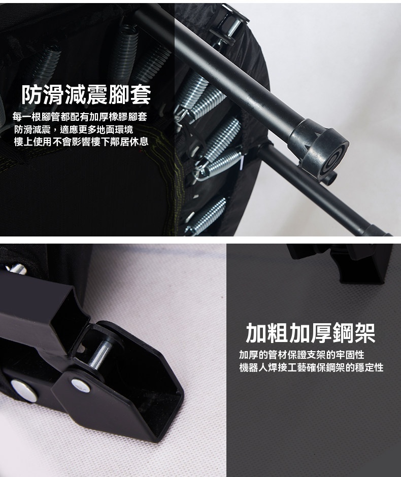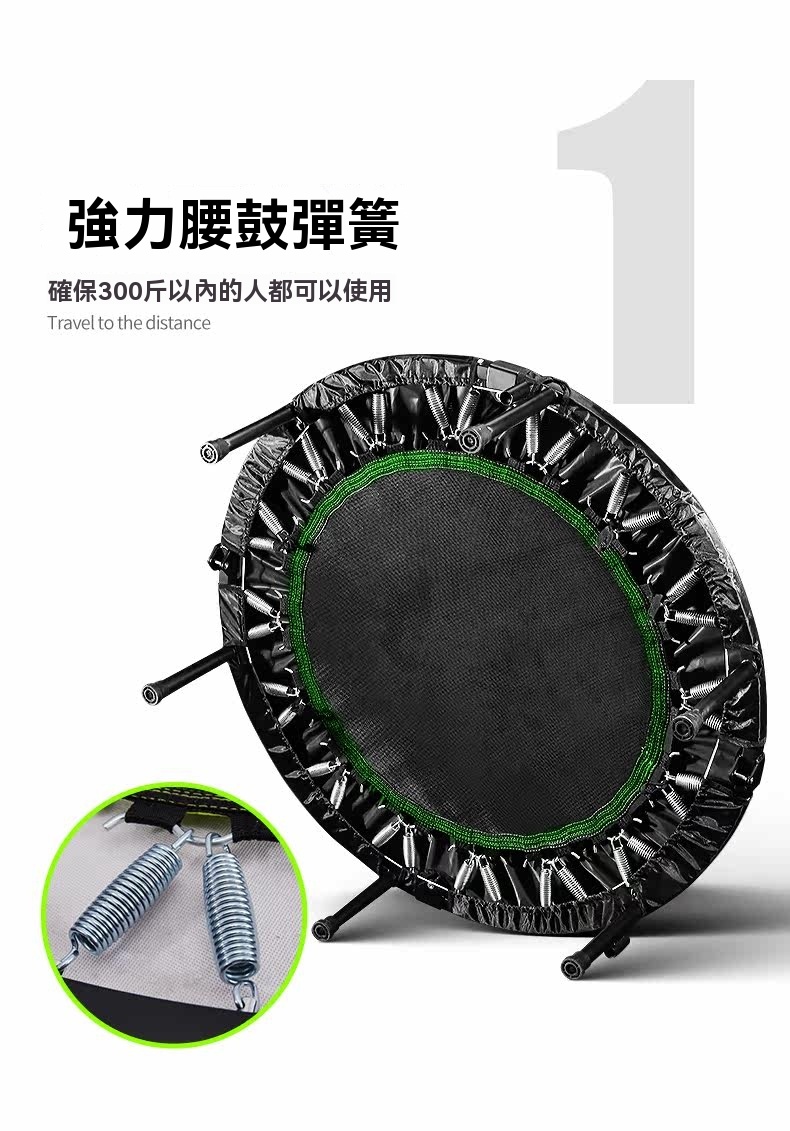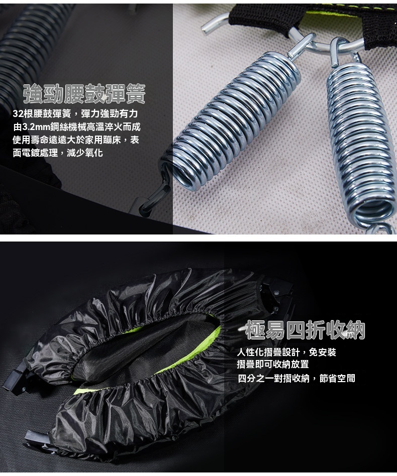 • 32根腰鼓彈簧:採用3.2mm鋼絲經高溫淬火及電鍍處理,彈力強勁,壽命遠超家用蹦床。