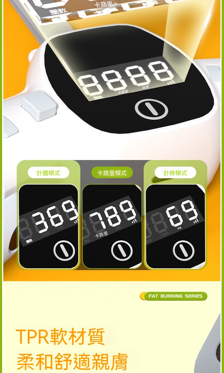 • 智能三模計數屏:配備高清顯示大屏,支援計圈、卡路里、計時三種數據模式,精準記錄運動數據,讓燃脂效果一目瞭然。