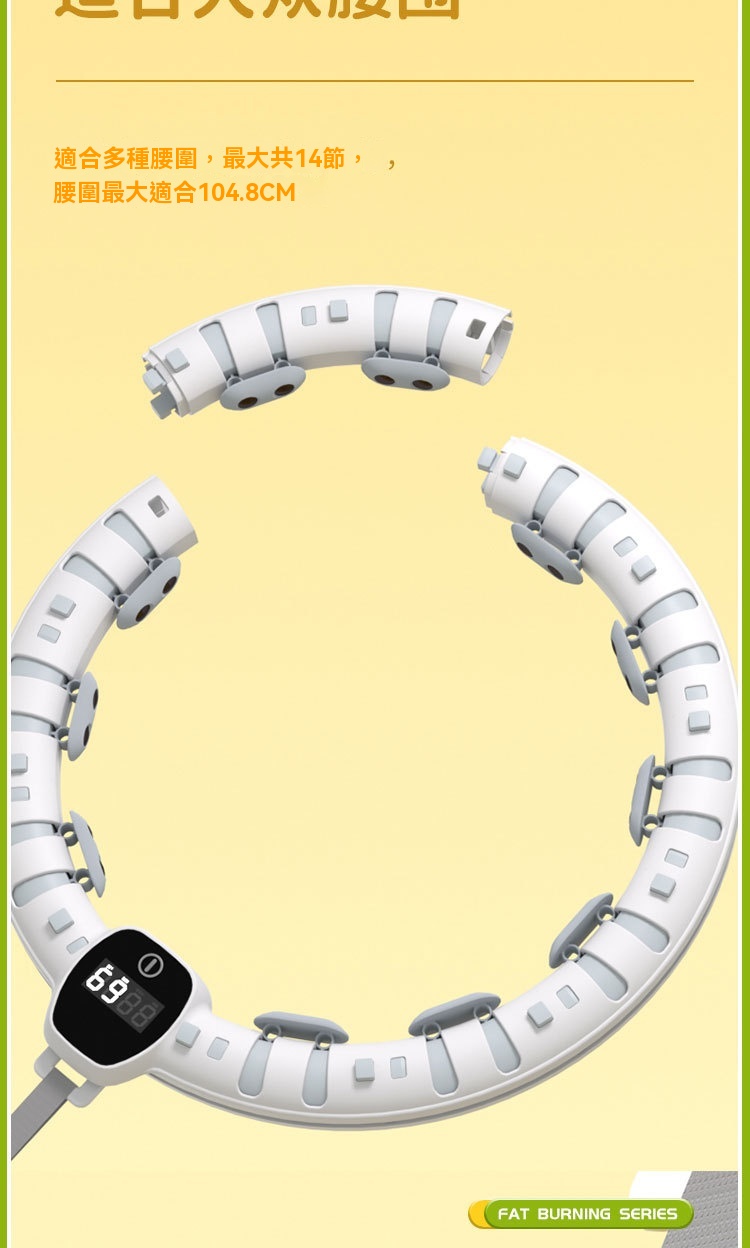 • 可調節伸縮腰圍:透過增減節數(最多14節)自由調節呼啦圈直徑,腰圍適用範圍廣,最大可達104.8公分,滿足不同身形需求。